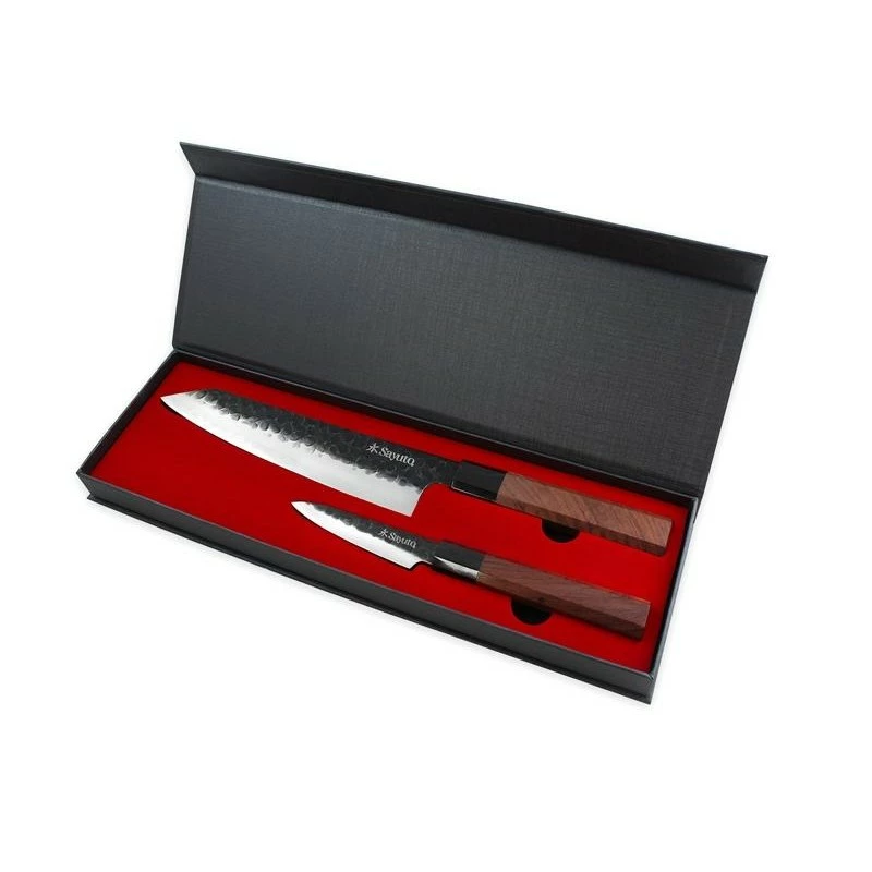 Le coffret 2 couteaux SAYUTO Séquoia San Maï – Chef Office est un ensemble de deux couteaux de cuisine, un couteau chef de 21 cm (réf. PM8S.CS) et un couteau office de 9 cm (réf. PM8S.SG). Ces couteaux sont conçus pour être utilisés à la main et ne doivent pas être lavés au lave-vaisselle.