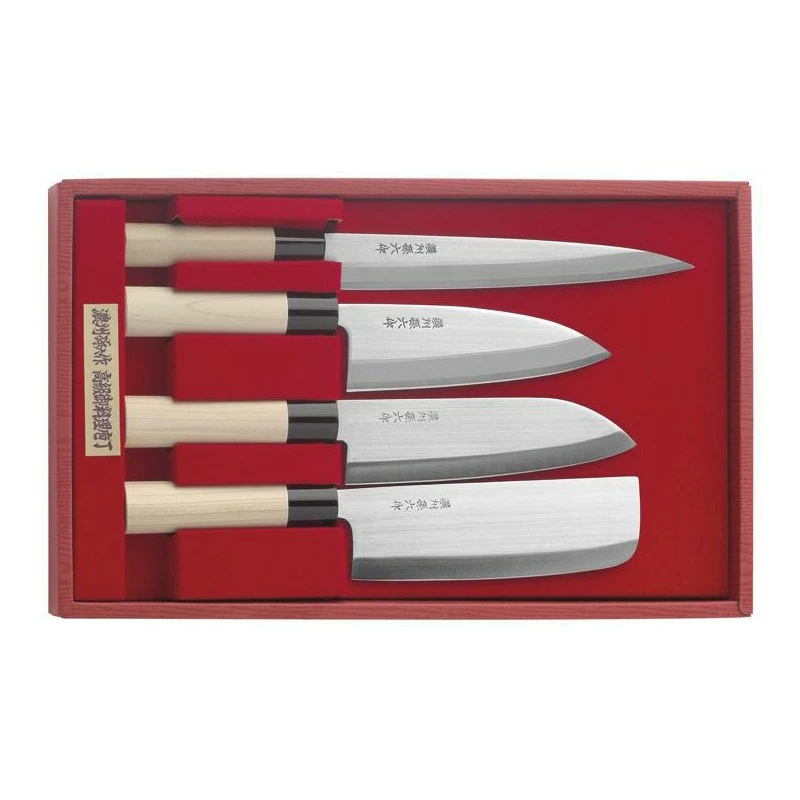 La cuisine Japonaise, c’est tout un art ! Pour réaliser de bons petits plats, dans les règles de l’art, rien de mieux que d’utiliser des couteaux de cuisine Japonais. Ce coffret en contient justement 4, ils ont l’avantage de tous être harmonieux et d’être adaptés pour la découpe de différents aliments. On retrouve par exemple un couteau idéal pour la réalisation de sushis et sashimis, des mets typiquement Japonais. Ce modèle possède une lame de longueur 21cm, il y a aussi un couteau Kodeba de 16cm pour optimiser la découpe du poisson. Enfin, on retrouve également un couteau Santoku et Nakiri, tous deux dotés d’une lame de 17cm de long. Le premier est très polyvalent, ou encore multi-tâches, le second convient plus particulièrement pour les légumes. Les 4 couteaux de cuisine Japonais sont dotés d’un manche en bois, avec une touche sombre entre la poignée et le manche pour la touche design. Ils sont bien mis en avant sur un tissu rouge conférant une allure classe et distinguée, pour ne pas dire luxueuse. Un coffret d’exception pour celles et ceux qui apprécient les couteaux Japonais, des modèles réputés dans le monde entier !