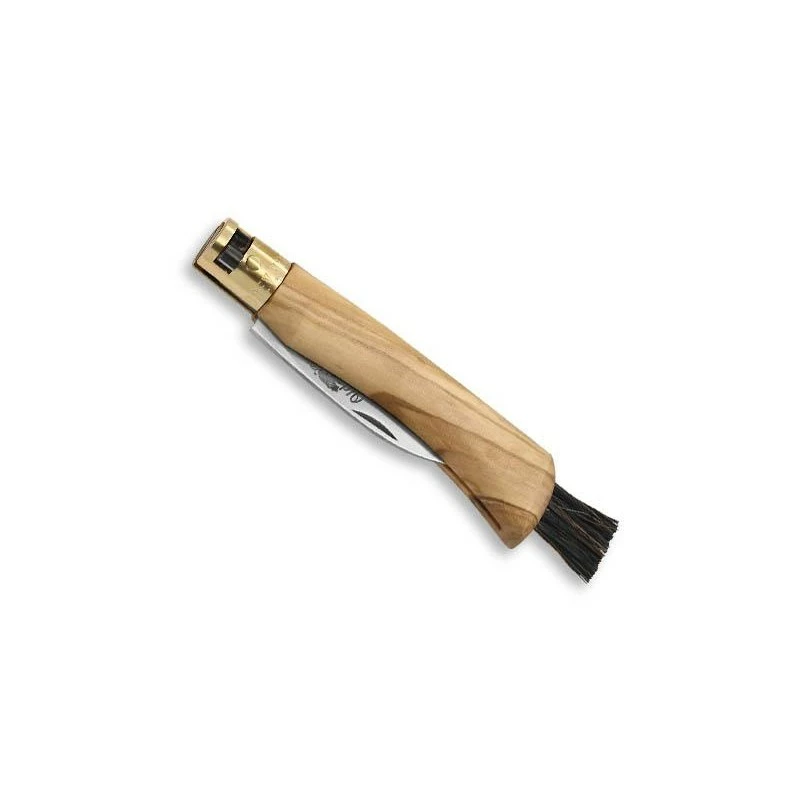 Le couteau à champignons Old Bear 308.C est doté d’un manche de 11cm de long, en bois olivier, un bois que l’on identifie facilement pour sa couleur claire. Agréable à manipuler, le manche en olivier assure aussi une facilité de port quotidienne, à chaque instant, on mentionnera aussi la présence d’une brosse en bout. Livré en boîte individuelle, ce couteau à champignons est fabriqué de façon artisanale, d’où la présence possible de petites irrégularités. Également disponible en version bois noyer.