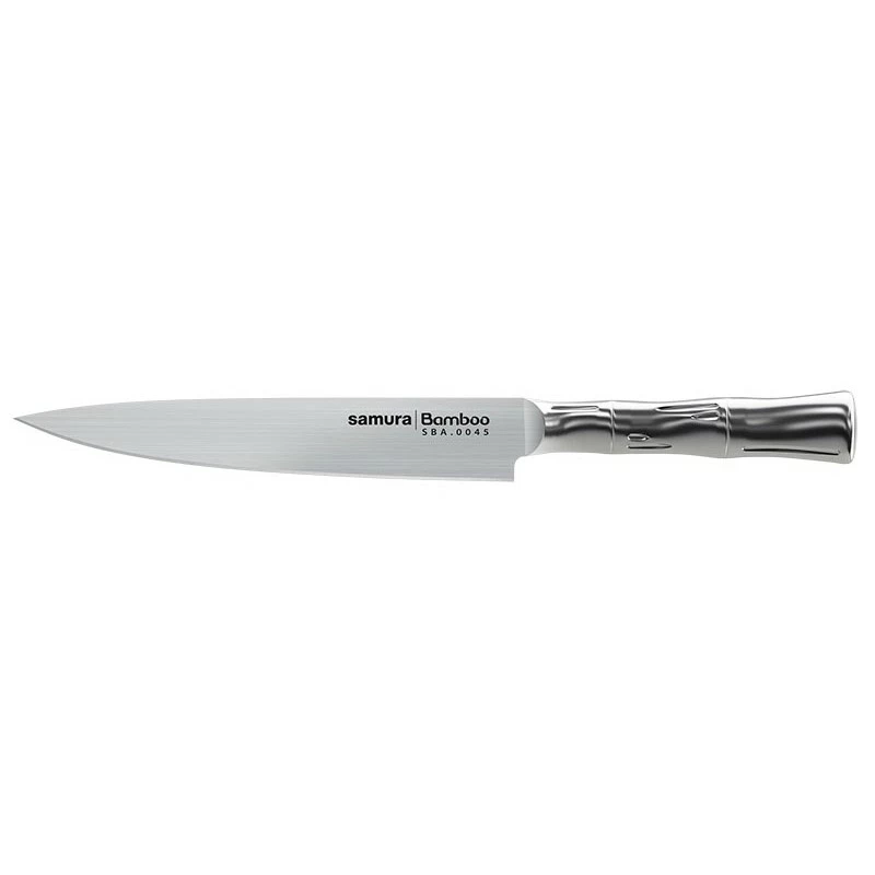 Les couteaux de cuisine de la gamme Bamboo du fabricant japonais Samura se caractérisent par le design tige de bambou de leur manche, une signature esthétique qui leur est propre. La forme de cette poignée garantit stabilité et adhérence de prise en main. Le couteau Yanagiba ref.SMSBA0045 mesure au total 32 cm de long pour un poids de seulement 127 grammes. Sa fabrication monobloc haut de gamme en acier japonais AUS-8 fait de lui un investissement à long terme ! D’une longueur de 19.4 cm, sa lame longue et fine est dotée d’un tranchant d’une incroyable efficacité permettant une variété d’usage possible, notamment la découpe de viandes, de poissons, de fruits et légumes. Son style atypique et ses excellentes performances de coupe font du couteau à découper Bamboo Samura un excellent ustensile tranchant pour équiper votre cuisine ou une super idée cadeau pour un ami cuisinier !