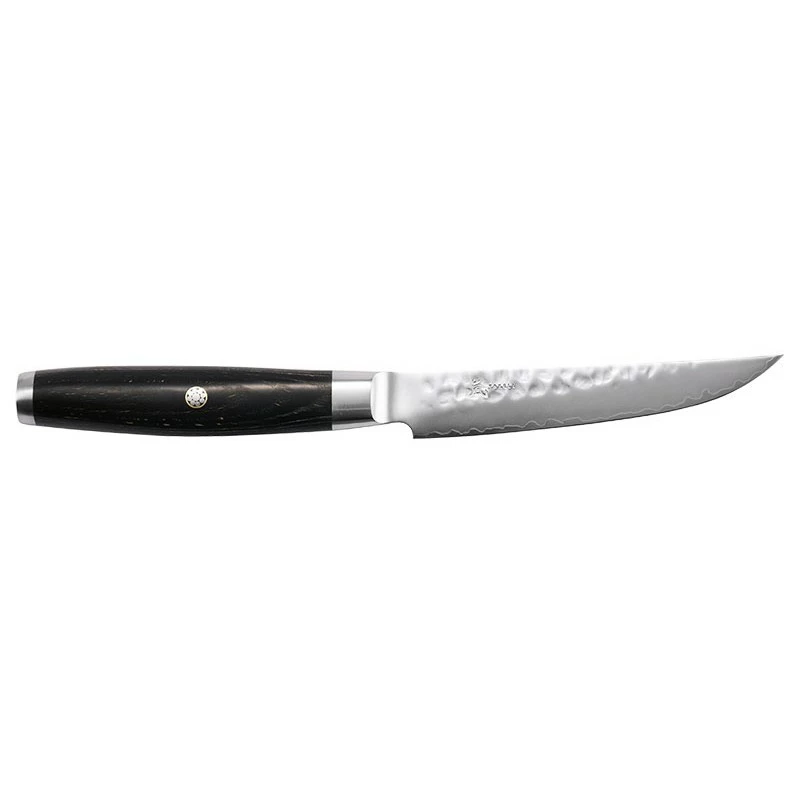 Le Ketu Y34913 est un couteau à steak de style japonais conçu par la marque Yaxell. Il ne fait aucun doute que votre table tirera profit de l’élégance de son design et de ses finitions remarquables. En atteste son manche en bois précieux de Pakka avec pommeau métallique orné d’une superbe gravure dorée. Parfaitement ergonomique, il dispose d’une silhouette arrondie qui permet une position naturelle de la main pour un confort optimal et une utilisation prolongée sans fatigue. Vos convives apprécieront de déjeuner avec un couvert d’une telle beauté, qui ne le serait pas ? Mais surtout, ils profiteront de ses performances de coupe exceptionnelles pour déguster leur viande et bénéficier de toutes ses saveurs. Il faut dire que le couteau Yaxell Ketu Y34913 est équipé d’une lame de 13 cm de long forgée à partir d’un des aciers les plus renommés dans le milieu de la coutellerie : le SG2. Ce matériau haut de gamme lui octroie un tranchant unique, qui permet de sectionner les fibres de la chair sans jamais ressentir de résistance. Celle-ci a été recouverte de 3 couches de damas martelé lui donnant ce style si particulier. Elles ont également pour intérêt que les aliments ne restent pas coller sur la lame. Ce couteau d’exception produit au Japon vous promet une entière satisfaction !