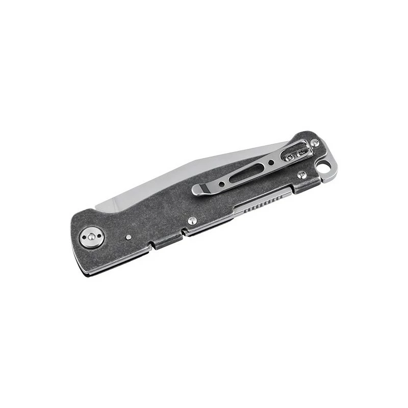 La poignée en acier inoxydable avec finition stonewash sombre donne au couteau une apparence élégante et résistante. Avec un clip de poche pratique et réversible, ce couteau est facile à transporter et est toujours prêt pour une utilisation immédiate.