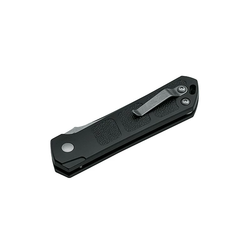 La lame se déploie à vive allure, par un simple appui sur le bouton poussoir situé sur le manche en aluminium noir avec éléments de texture pour le confort de prise en main. Légère, la poignée se montre très maniable, et se dote d’un trou de lanière en bout ainsi qu’un clip détachable relativement court au dos (tip-up). Le Kihon Auto Stonewash est un couteau automatique tactique robuste, vendu à un tarif attractif. Rappelons que Böker est une très célèbre coutellerie Allemande. L’épaisseur de la lame est de 2,9mm.