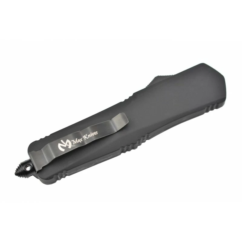Le Max Knives MKO32 est un couteau automatique OTF doté d’un manche de 142mm de longueur fabriqué en alliage de zinc et d’aluminium, il est de couleur noire. Agréable à manipuler et élégant, il intègre aussi un clip de poche ainsi qu’un brise-vitre se révélant être redoutable d’efficacité lors des situations urgentes. Sur le côté de la poignée, se trouve un bouton simple d’utilisation, à l’origine du déploiement de la lame, vers l’avant. Le couteau automatique OTF MKO32, par Max Knives, possède une lame à double tranchant, essentiellement noire mais ajourée au centre pour un effet toujours plus design. La lame est fabriquée en acier 440C ce qui lui confère un tranchant de qualité ainsi qu’une bonne résistance à la corrosion, elle mesure précisément 9cm de long. La longueur totale du couteau automatique OTF MKO32 est de 235mm. Livré avec un étui en nylon.
