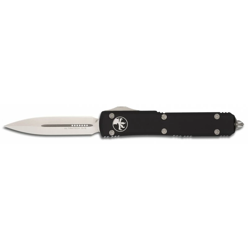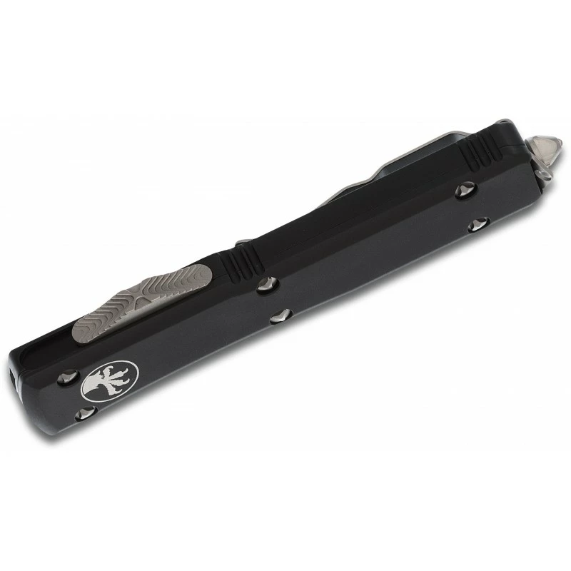 Le Microtech 122-4 Ultratech est un couteau automatique OTF (Out The Front) : cela signifie que l’éjection de lame se fait par l’avant. Fabriqué à 100% aux USA, ce modèle est de très grande qualité et par conséquent extrêmement fiable. Côté manche, il est fabriqué en aluminium anodisé noir (6061-T6) et mesure 12cm de long afin de garantir une facilité de transport quotidienne. Il faut mentionner la présence du logo Microtech en blanc afin de parfaitement ressortir par effet contrasté. Pour que la transportabilité soit la meilleure possible, le couteau automatique Microtech Ultratech 122-4 intègre également un clip de poche au dos de la poignée noire. À double tranchant, la lame de 86mm est ajourée par 7 petits trous avec juste en-dessous l’inscription “ULTRATECH D/E“. On peut aussi observer au niveau du coin supérieur le texte “USA” faisant référence à la fabrication 100% Américaine. Simple d’utilisation, ce couteau automatique Microtech 122-4 s’utilise de la façon suivante, il faut faire coulisser le bouton pour déployer la lame à l’avant (système OTF). Un excellent tranchant qui vous permettra de surmonter tous les obstacles !
