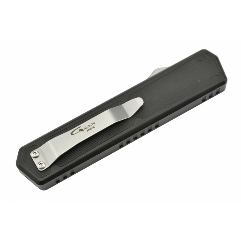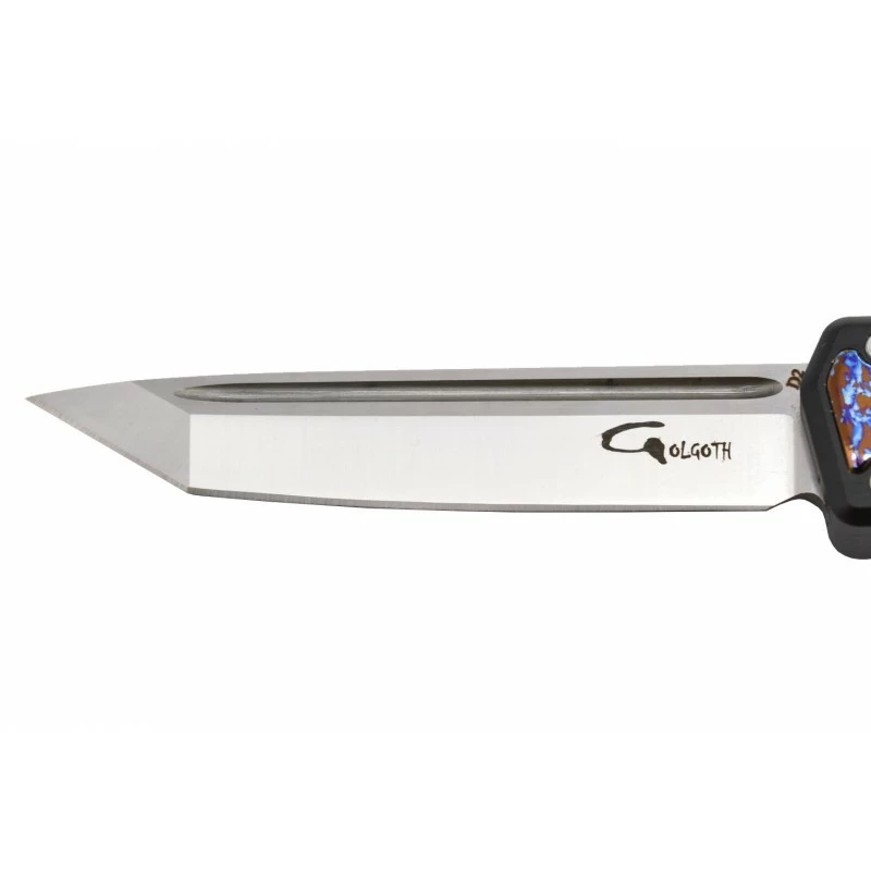 Pour celles et ceux qui aiment les couteaux automatiques et l’originalité, alors le Golgoth G6T est parfait. Un couteau automatique à ouverture frontale (OTF) qui ne manquera pas d’attirer l’attention en raison de son manche en aluminium anodisé noir avec insert en titane anodisé, finition crazy. Signifiant “folle” ou encore “délirante”, la finition crazy est relativement claire, ainsi que décorée par de nombreuses nuances de couleurs. Le résultat est juste magnifique, nous vous laissons le soin de l’admirer à votre guise ! Mesurant 112mm de longueur, la poignée originale est aussi simple à transporter, elle intègre au dos un clip de poche en acier inox, embelli par le logo Golgoth.
