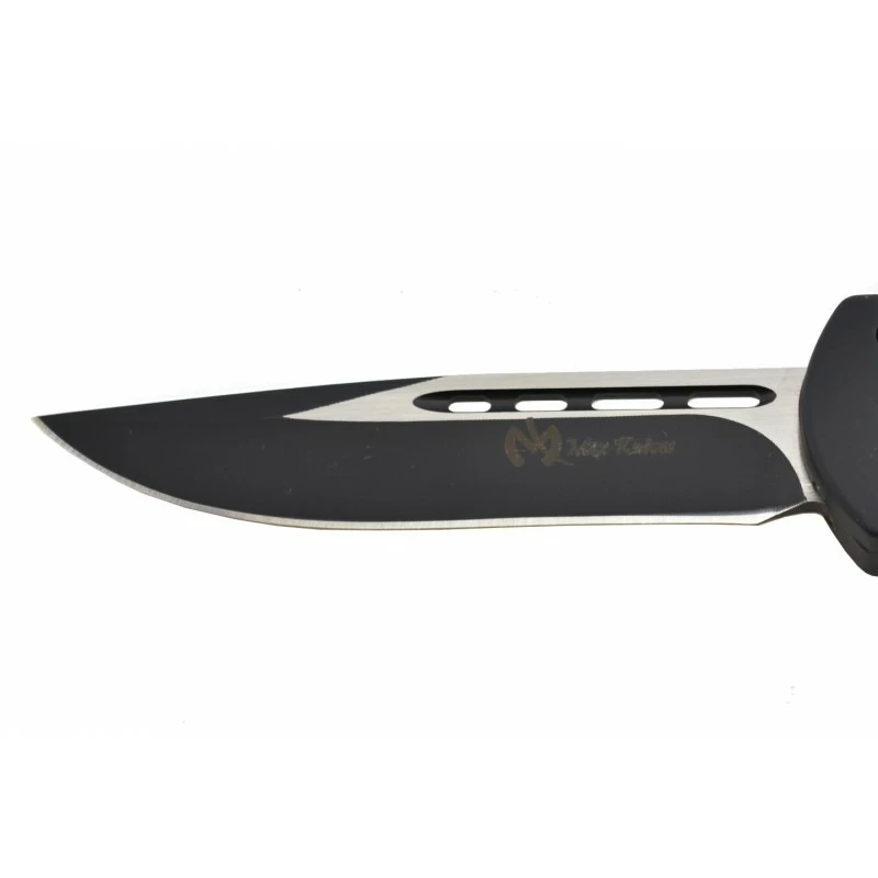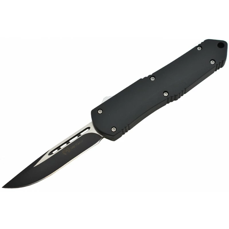 Le Max Knives MKO43 est un couteau automatique à ouverture frontale (OTF) au style tactique. Son manche en aluminium noir de 123mm de longueur est agréable à tenir en main, il intègre un trou pour cordon en bout à l’origine d’une meilleure transportabilité. Sur la tranche de la poignée, on observe un bouton à faire glisser qui permet d’actionner la lame “droit devant”. Livré avec son étui ceinture en nylon afin de toujours conserver le couteau automatique sous la main lors des déplacements.