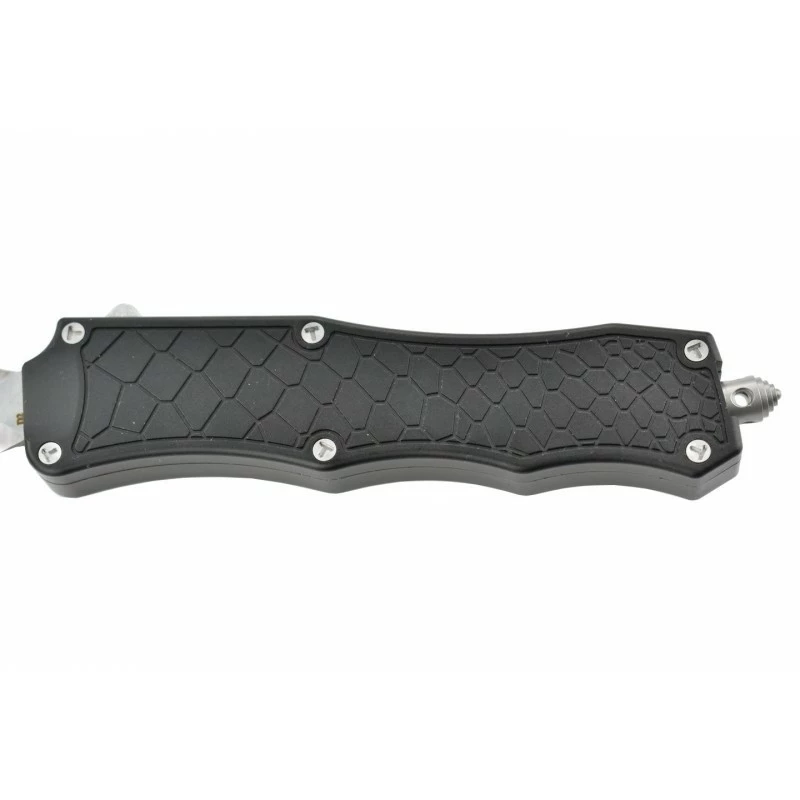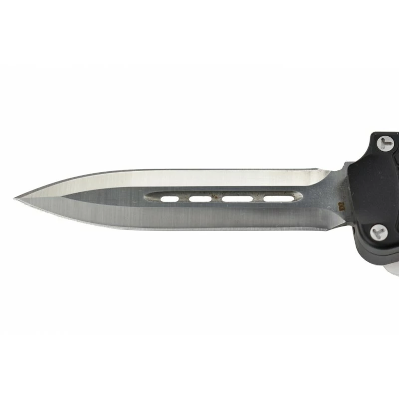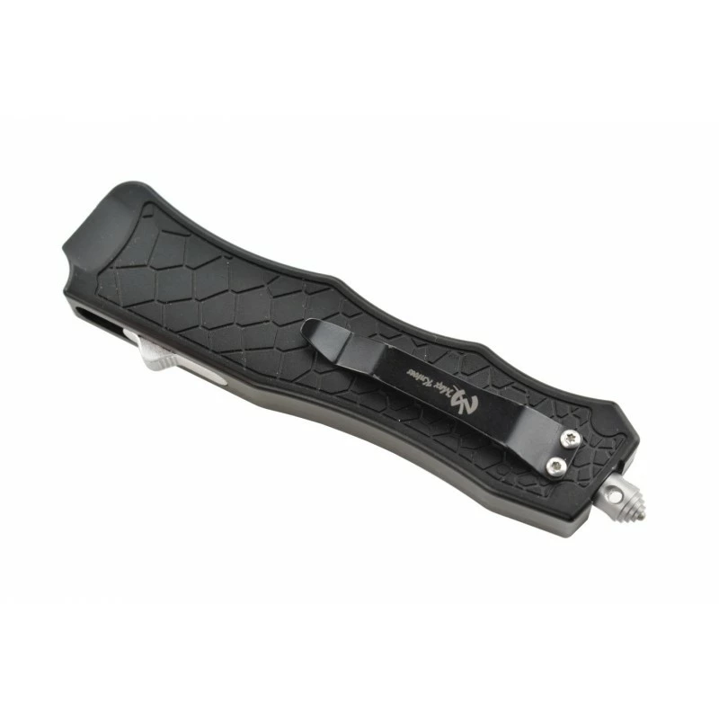 Le Max Knives MKO7DT est un couteau automatique OTF qui se dote d’une lame de 8cm de longueur (épaisseur 3mm) en acier D2, à double tranchant pour des performances optimales. La lame spear point confère une apparence plus agressive, elle est ajourée au niveau du centre par des rectangles à bords arrondis. Le manche est fabriqué en aluminium anodisé noir avec la présence de motifs façon écaille, il mesure 13cm ce qui rend le transport du couteau automatique Max Knives MKO7DT relativement simple. Sur le côté du manche, on observe un bouton coloris gris argent qui vous l’aurez deviné, sert à déployer la lame rapidement afin d’intervenir efficacement en cas de besoin. Avec clip de poche pour la facilité de port et brise-vitre pour l’urgence. Le Max Knives MKO7DT est livré avec son étui de protection ceinture en nylon, parfait pour en prendre soin.