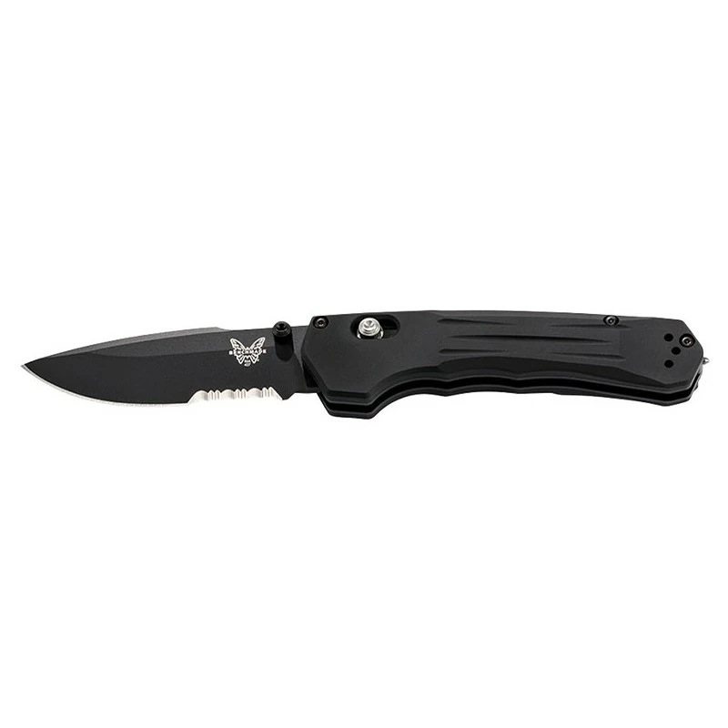 Parfait pour l’usage quotidien ou tactique, ce couteau Benchmade Mini Vallation 427SBK est doté d’une lame lisse/crantée de 81mm en acier inox CPM S30V, revêtement noir. Une lame à la fois tranchante et robuste sur laquelle on peut apercevoir le logo de la coutellerie Benchmade, en blanc. À noter que grâce à son bord lisse et denté, la lame se montre très polyvalente. Le Benchmade Mini Vallation 427SBK, c’est aussi un manche noir en aluminium résistant et ergonomique. Il tient très bien en main et fait office de brise vitre pour intervenir efficacement lors des situations urgentes. Pratique, le manche est compact pour une excellente transportabilité quotidienne : un couteau de poche qui vous accompagnera partout sans aucune difficulté ! Système d’ouverture de type Axis lock.
