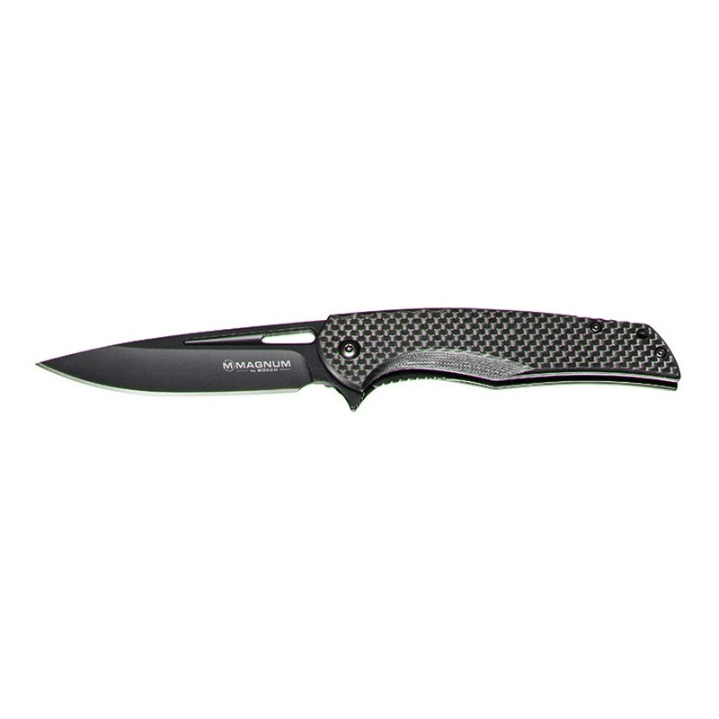 Le Black Carbon, signé Böker Magnum, modèle 01RY703, est un couteau pliant qui va beaucoup plaire, notamment par son aspect entièrement noir. La lame noircie de 9cm de longueur est fabriquée en acier inoxydable 440A et comporte un ajour pour un style remarquable, et remarqué ! Elle est embellie par le logo Magnum by Böker de couleur claire pour une meilleure visibilité, le flipper permet de déployer la lame aussi facilement que rapidement.