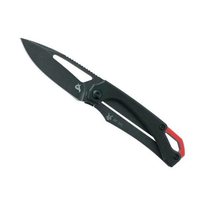 Le couteau Black Fox Racli, de Denis Simonutti, dans sa version entièrement noire, du moins Ă un petit dĂ©tail près, qui fait comme d’habitude toute la diffĂ©rence. En effet, le manche de 8cm de long est fabriquĂ© en G10 au recto, et acier inoxydable au verso, avec toutefois une entretoise en aluminium anodisĂ© rouge pour la touche stylĂ©e, moderne, qui attire fortement l’attention. DotĂ© d’une jolie finition Blackwash, ce couteau Black Fox Racli BF.745 intègre un clip de poche au dos, rendant les dĂ©placements et mouvements aisĂ©s en toutes circonstances.
