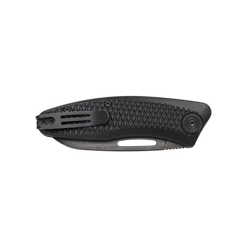 Le manche de ce couteau est en aluminium anodisé noir, offrant une excellente prise en main et un confort optimal lors de son utilisation. Le clip et le spacer en acier inoxydable ajoutent une touche de sophistication à l’ensemble.