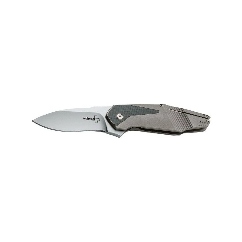 Couteau Böker Plus 01BO140 FEDERAL, lame drop point satinée en acier 440C, manche en Titane plus inserts en fibre de carbone, verrouillage type Frame lock, ouverture assisté par flipper, clip de ceinture auto