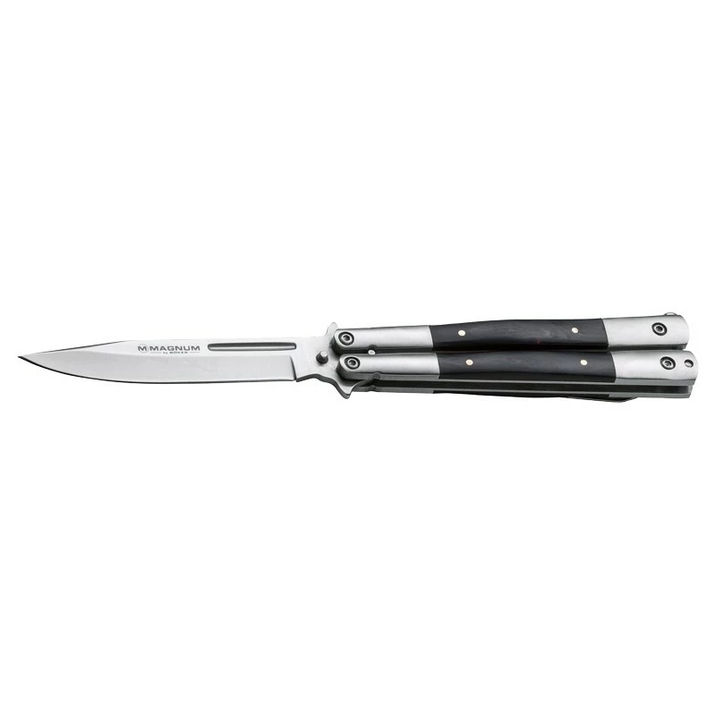 Le Böker Magnum Balisong Wood est un couteau papillon possédant une longue lame de 103mm de long en acier 440er. La lame est marquée du texte “Magnum” : vous pouvez également ajouter votre propre gravure. Le manche lui, mesure 107mm de long, et est muni d’une finition Pacawood qui rend ce couteau papillon Böker juste sublime. Vous allez adorer le regarder et surtout l’utiliser d’une seule main !