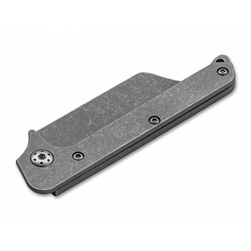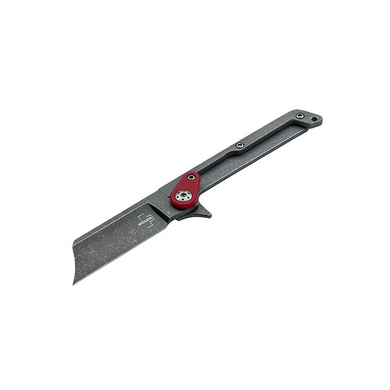 Le Fragment Böker Plus se montre très convaincant en tant que couteau EDC, pour la vie quotidienne au jour le jour. On remarque immédiatement son design réduit, ainsi que sa finition stonewashed délavée intégrale pour un masquage optimal des rayures. Le couteau Böker Plus Fragment 01BO661 possède une lame Sheep Foot (pied de mouton) de 5cm de long en acier inoxydable 9Cr13MoV. Elle est décorée par le logo Böker Plus en blanc, ce qui ajoute une touche design très appréciable, et appréciée ! Le Fragment est un couteau slip-joint doté d’un manche mesurant 8cm de long, on comprend mieux pourquoi il est si simple de le transporter. Une barre minimaliste en G10 rouge vient apporter la note colorée qui fait la différence en matière d’esthétisme. Bien sûr, elle n’est pas uniquement là pour décorer puisqu’elle relie l’axe de la lame à la poignée.