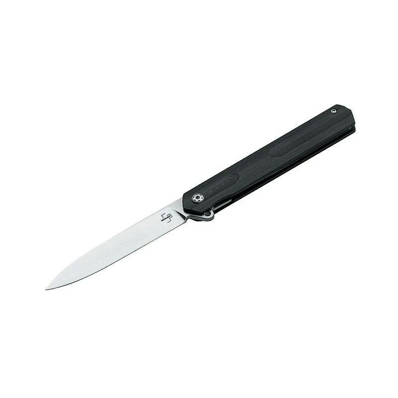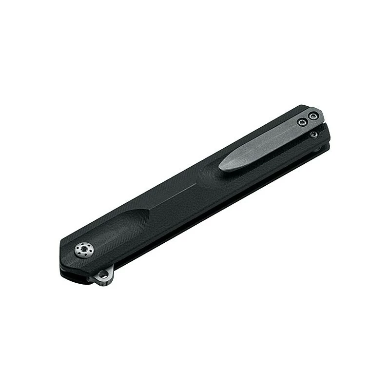 Le Böker Plus Kyoto, modèle 01BO241, est un couteau pliant de type gentleman, au design mince et harmonieux. Il possède un manche en G10 noir fraisé en 3D, ce qui confère une allure moderne mais aussi une prise en main confortable en toutes circonstances. La poignée noire mesure 113mm de long, un gabarit dont la taille est largement acceptable, la preuve, c’est que le couteau Böker Plus Kyoto pourra être rangé dans une poche sans la moindre difficulté !