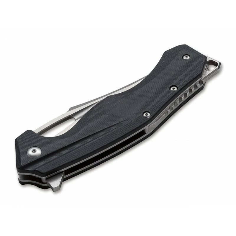 Le manche du couteau Böker Plus Masada Folder est conçu en G10 noir, sa forme est dans la lignée de celle de la lame, à savoir percutante ou encore frappante. Il est confortable à manier et intègre un solide trou pour cordon sans oublier le clip de poche pour faciliter les déplacements quotidiens. Esthétique et performant, le Masada Folder ne vous décevra jamais !