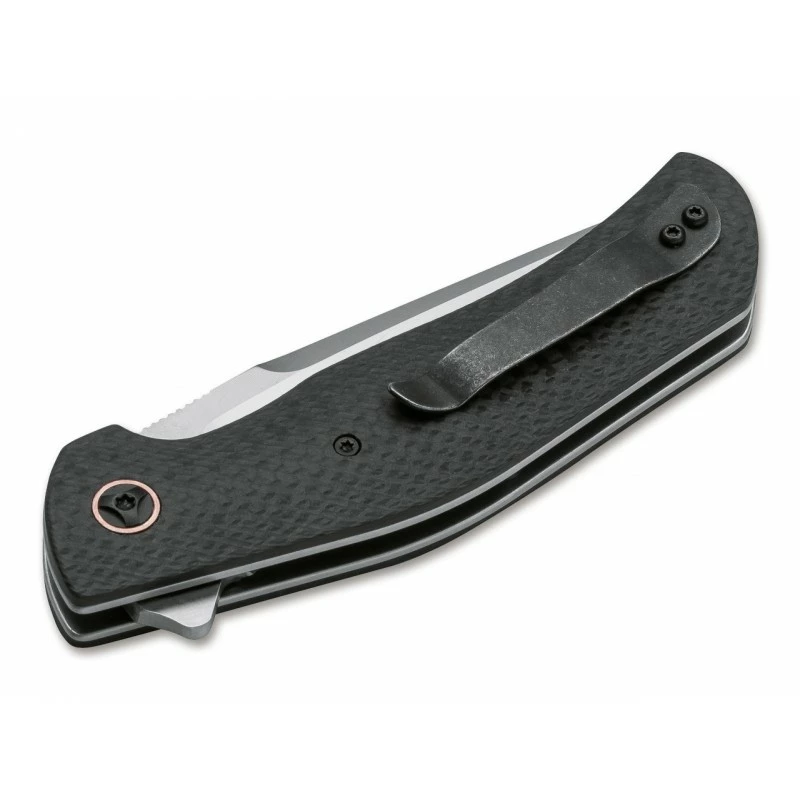 Le couteau pliant Roundhouse Böker Plus possède un manche noir en fibre de carbone, légèrement incurvé afin d’assurer des manipulations toujours très confortables. Le dos de la poignée comprend un clip de poche à l’origine d’une facilité de port sans précédent. La longueur du manche est également à l’origine de la très grande facilité de port du couteau Böker Plus Roundhouse 01BO617. Il ne mesure que 116mm de long en position fermée.
