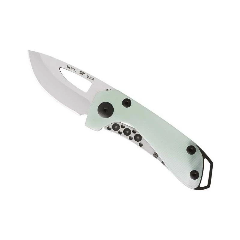 Le couteau Buck Budgie 0417GRS est pourvu d’une lame drop point d’environ 5cm de longueur, en acier S35VN. Se verrouillant par le biais d’un mécanisme frame lock, la lame intègre un large trou ce qui permettra de l’ouvrir simplement d’une seule main. Lame marquée par l’inscription Buck USA indiquant une fabrication Américaine, possibilité de gravure en supplément. Existe aussi en version manche G10 noir.
