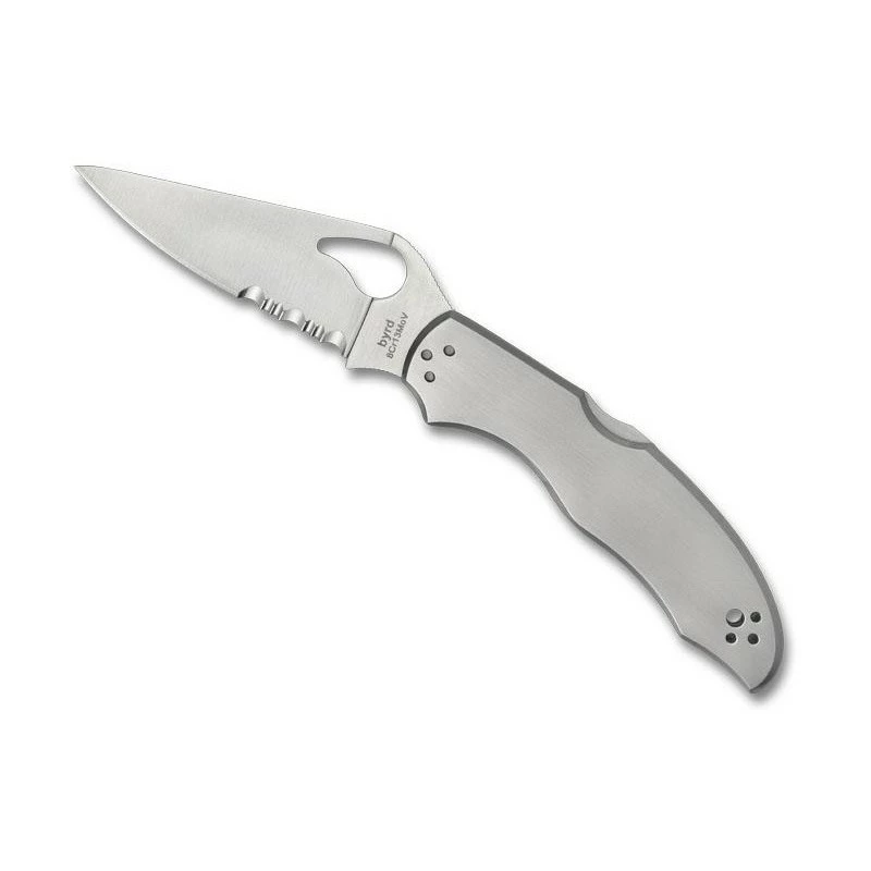 Ce couteau Byrd Knife, par Spyderco, porte la référence BY01PS2. Il s’agit de la version “lame mixte” du modèle Harrier 2. Par cela, il faut entendre que la lame de 86mm, toujours fabriquée en acier inox 8Cr13MoV, comprend un bord lisse ainsi qu’un bord à dents. Le tranchant lisse est utile pour réaliser des tâches précises, minutieuses, tandis que le tranchant denté sera plutôt utilisé pour les opérations nécessitant de la puissance de coupe. Se verrouillant grâce au verrouillage back lock, la lame est ajourée par une forme originale et non ronde comme c’est souvent le cas chez Spyderco. Ne pas oublier qu’il est envisageable de graver la lame en supplément.