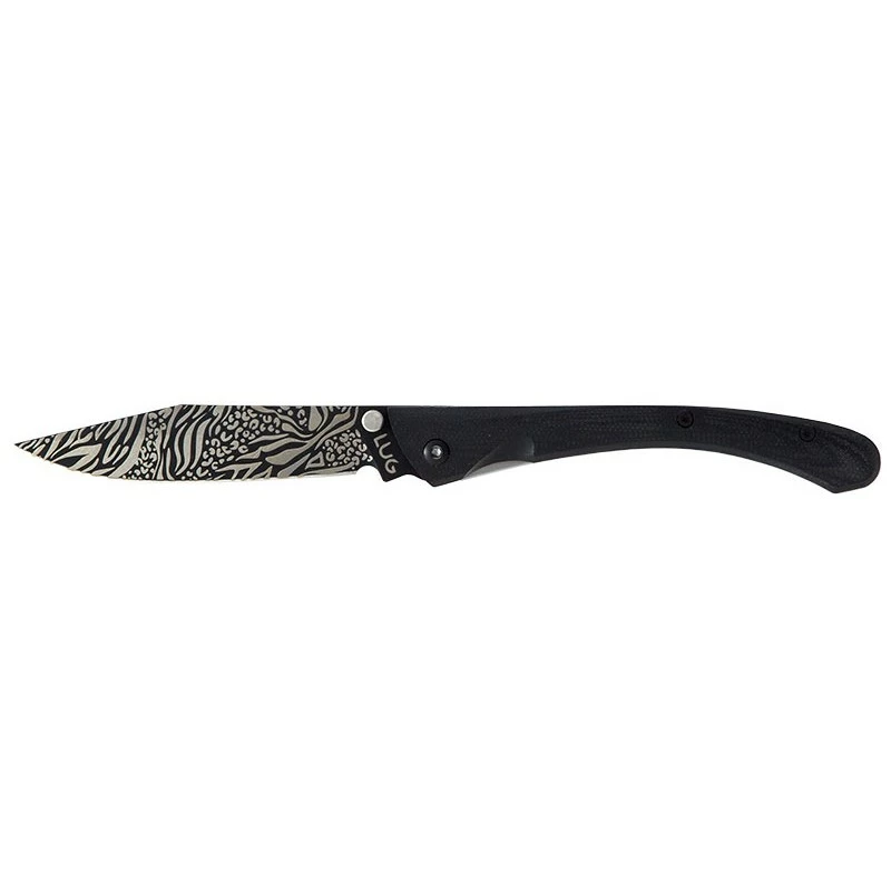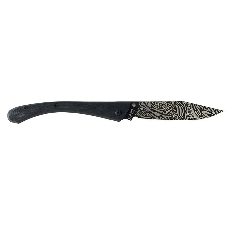 Issu de la collection LUGART LIMITED, ce couteau pliant C63 Animal est designé en France par Cyril Ganivet. Léger et design, il est caractérisé par une lame en acier inoxydable 7Cr17MoV au revêtement titane noir PVD. Mais ce qui fait toute son élégance, c’est incontestablement sa gravure laser d’un motif tatouage “animal” sur chacune des faces. Vous ne vous lasserez pas de l’admirer, ni de l’utiliser ! Son déploiement est par ailleurs facilité par la présence d’un bouton de pouce volumineux positionné juste à côté de l’inscription LUG.