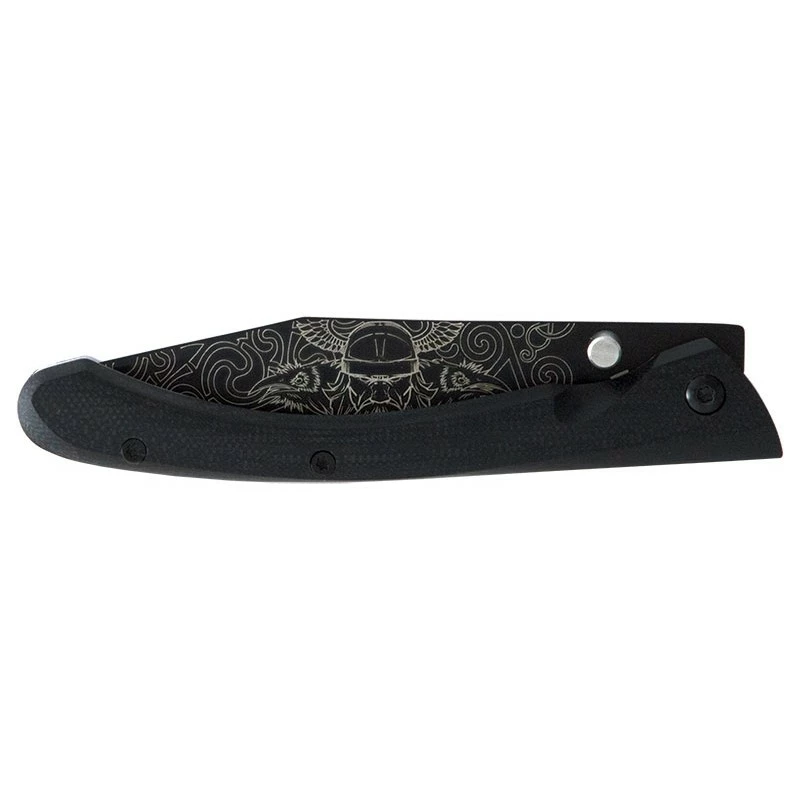 Appartenant à la collection LUGART LIMITED, ce couteau pliant C63 Dieu LUG possède une lame noire au tranchant lisse, fabriquée en acier inoxydable 7Cr17MoV. Elle est enrichie par un élégant tatouage au niveau des deux faces : dieu lug ainsi que corbeau. À noter que les tatouages sont réalisés grâce à la technologie “laser”. Revêtement en titane noir PVD.