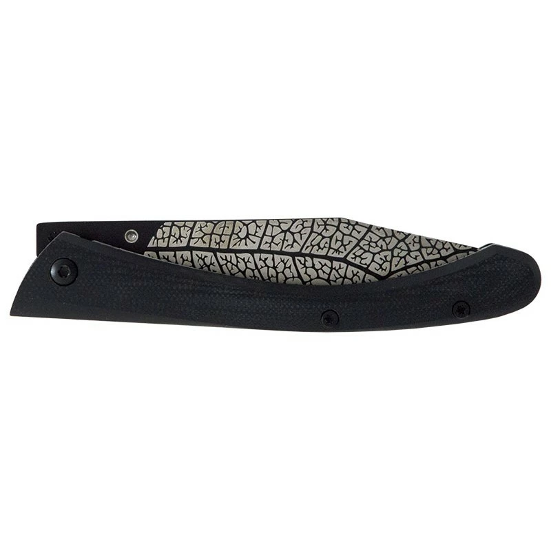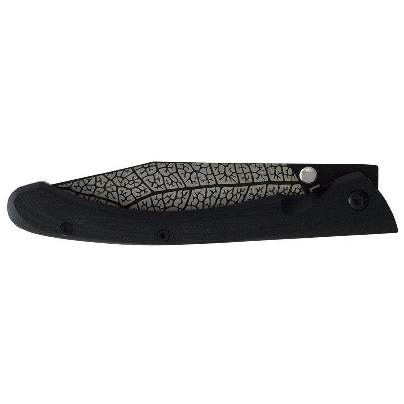 La nature à l’honneur avec ce couteau de poche C63 de la série Lugart Limited. Sa lame d’environ 8cm en acier inoxydable 7Cr17MoV, à la finition black titanium, est agrémentée d’une belle décoration feuille présente sur chacune des faces. Un “tatouage” très naturel qui est fièrement gravé au laser sur la lame simple à déployer grâce au bouton prédominant. Le verrouillage est ici de type frame lock.