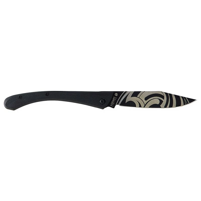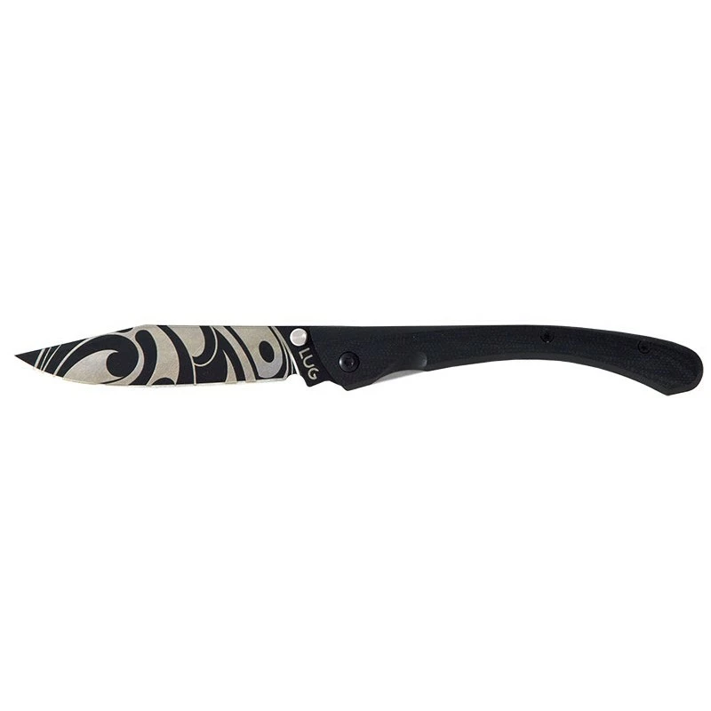 Designé et assemblé en France par LUG, ce couteau C63 Tattoo LUGART possède un manche en acier inoxydable et G10 noir usiné de façon remarquable. Sa forme est particulièrement harmonieuse, son ergonomie est également excellente. Sa longueur de 115mm couplée à un poids plume de 80 grammes font que ce couteau se transportera sans encombre au quotidien. D’autres motifs sont disponibles pour la collection LUGART Limited.