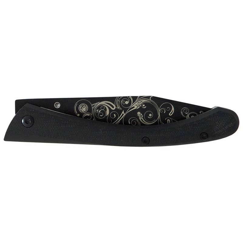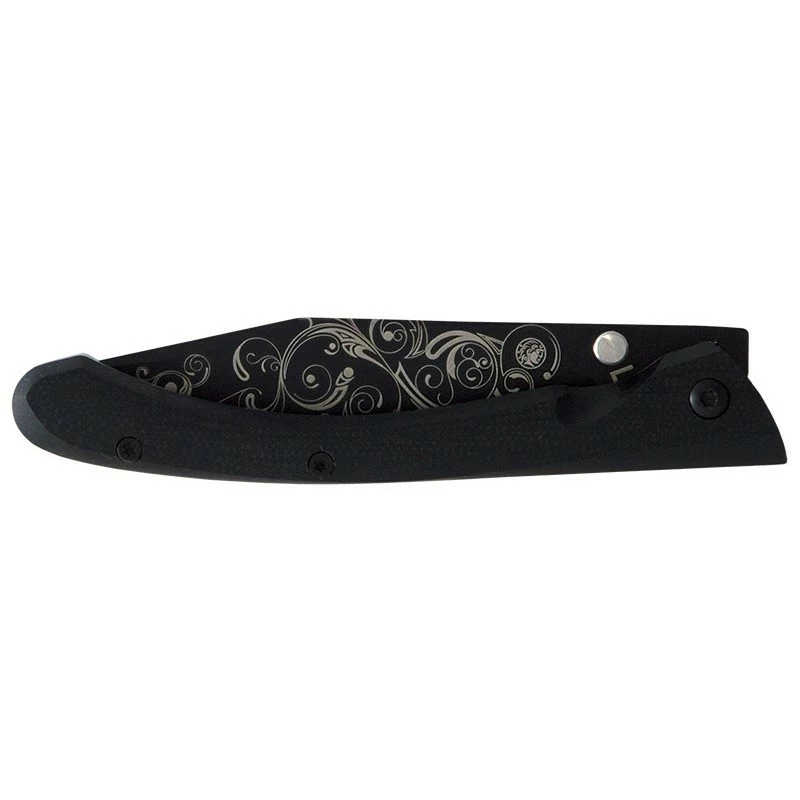 Conçu par Cyril Ganivet, ce couteau C63 LUG est doté d’une lame d’environ 8cm de longueur conçue en acier 7Cr17MoV (0.7% carbone, 17% chrome, molybdène-vanadium). Elle comporte un revêtement en titane noir PVD et s’avère être gravée au laser par des volutes, des motifs en forme de spirales notamment employés dans l’architecture. De jolies décorations qui sont en grande partie “responsables” de l’esthétique à couper le souffle du couteau de poche.