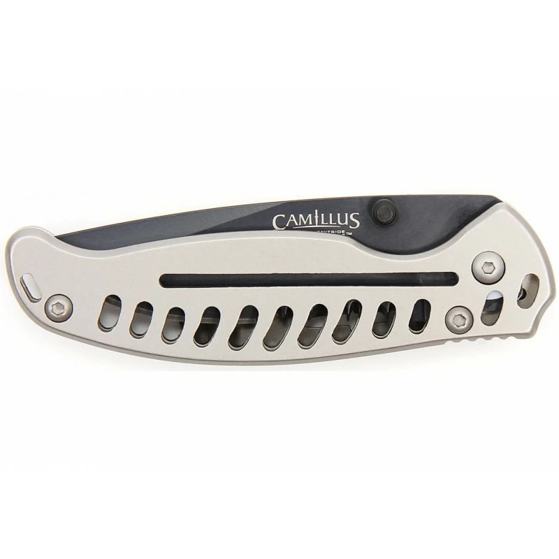 Le Camillus EDC3 est incontestablement un excellent couteau pliant pour un usage quotidien. Cela explique son nom, car il faut savoir que EDC signifie Everyday carry. Ce modèle 19166 possède une lame d’environ 72mm de long en acier AUS-8 avec traitement Carbonitride titanium. Cela améliore considérablement les performances, notamment la résistance à la corrosion. La lame noire est partiellement dentée pour une polyvalence toujours plus grande, il intègre un double boutons ainsi que le système de fermeture liner lock. La lame est comme c’est souvent le cas marquée par le logo Camillus avec inscription Carbonitride Titanium, de couleur claire pour le contraste. Le manche du couteau pliant Camillus EDC3 est argenté, ajouré, et fabriqué en acier inoxydable. La poignée apporte, grâce à ses multiples ajours, de la légèreté, elle mesure 10cm de long afin de faciliter les déplacements quotidiens. Quoi de plus normal pour un couteau de type EDC !