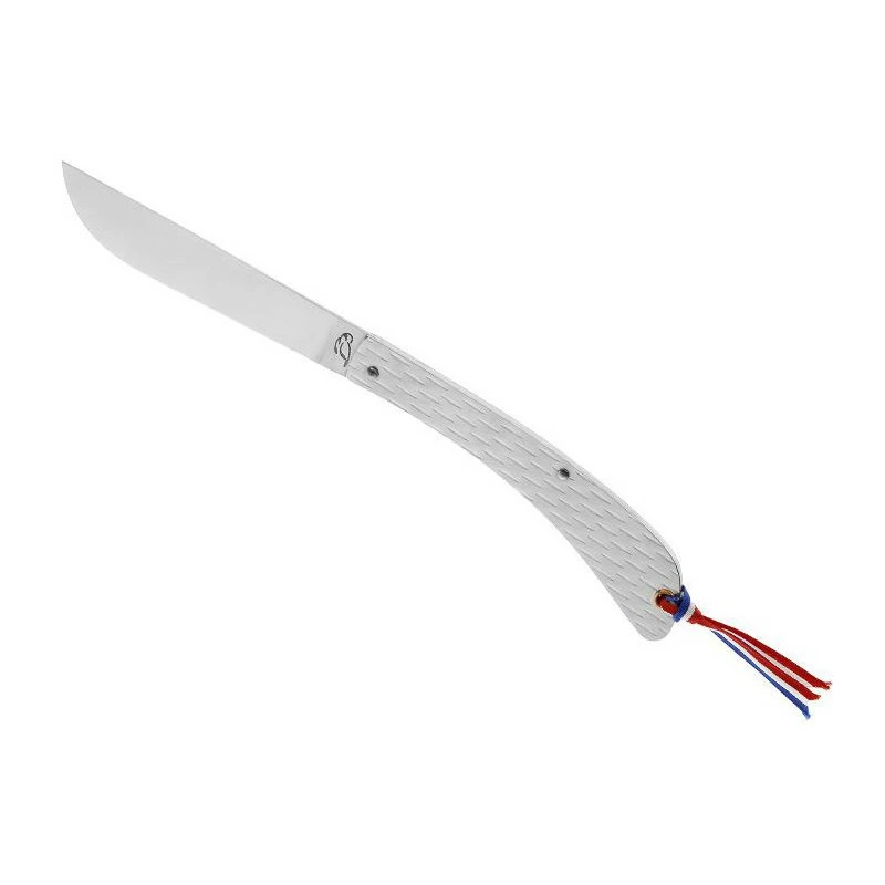 Léger et ultra-plat, voilà comment il est possible de rapidement décrire le Charlie Maridet N°1 Full Métal Grain de riz. Un couteau de poche pliant, 100% made in France, dont le manche de 11cm de long (facilité de port) est fabriqué en acier inoxydable, avec de nombreuses décorations en relief motif grain de riz. Très élégante, la poignée est aussi très agréable à prendre en main, elle est décorée en bout par un ruban tricolore (bleu, blanc, rouge) rappelant avec style que la fabrication est Française.