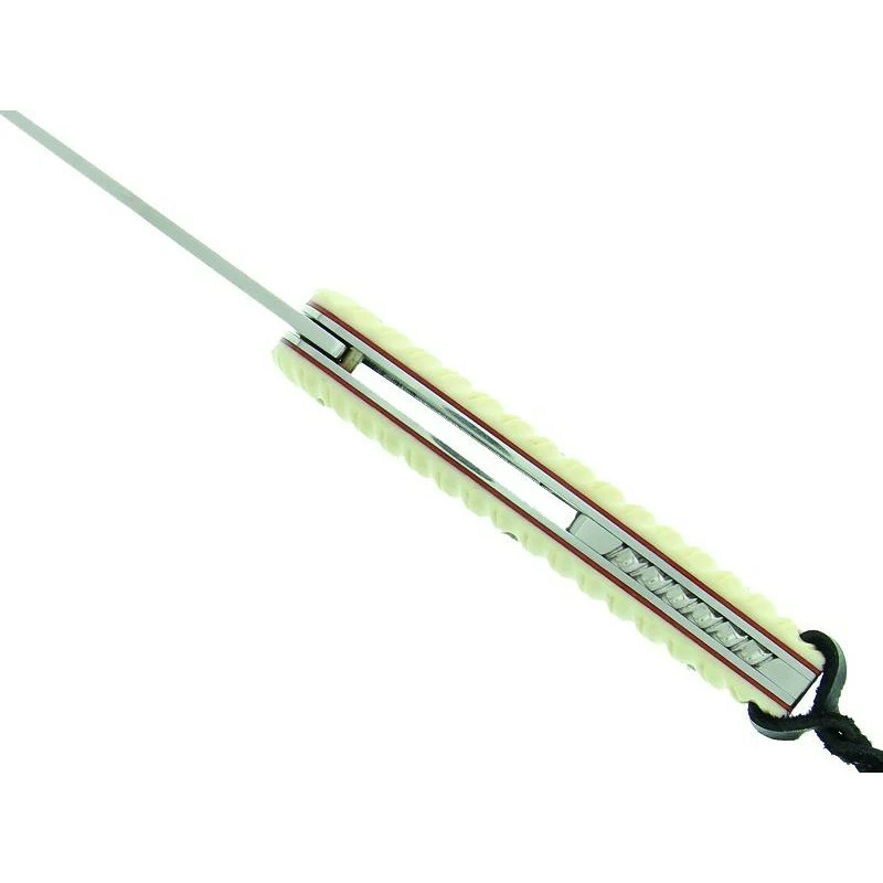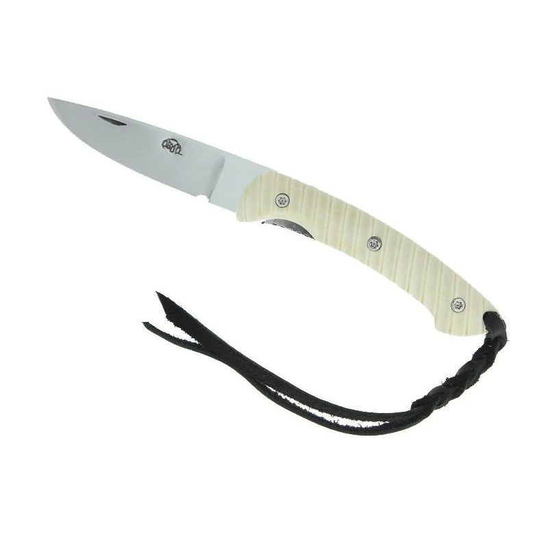 Le Citadel Kampot 63120 est un couteau de poche fabriqué artisanalement : c’est un modèle de très bonne facture. Et son appellation “couteau de poche” ne doit rien au hasard, c’est parce que son manche mesure 11cm de longueur, autant dire qu’il tiendra sans problème dans toutes les poches, même les plus petites. Robuste, le manche est aussi très élégant : il est fabriqué en os de buffle blanc avec intercalaire rouge. À noter que le manche est aussi qualifié de “zebra” en raison de ses nombreuses rayures décoratives. Un lacet noir est également présent pour pouvoir accrocher n’importe où le couteau Citadel Kampot 63120, un lacet très pratique lors des sorties Outdoor. Côté lame, pas de surprise, elle est encore une fois conçue en acier inoxydable N690Co, c’est l’acier le plus utilisé chez la coutellerie Citadel. Ce couteau est livré avec sa pochette en nylon très pratique lors des transports.