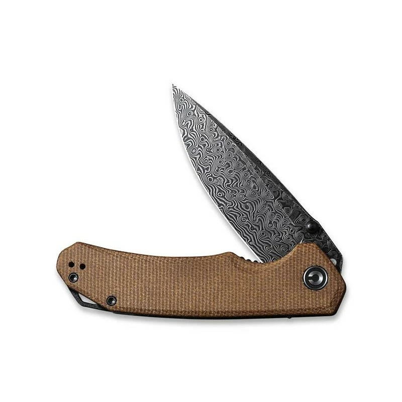 Ce couteau Civivi Brazen, référence C2102DS1, a une allure rustique, ou encore authentique si vous préférez. Cela vient notamment de son manche en acier inoxydable noir enrichi de plaquettes en micarta brun. Ce mélange de résine, coton et papier peut en effet faire penser au cuivre. La poignée mesure ici 115mm pour la facilité de port, il y a d’ailleurs un clip de couleur noire au verso, n’oubliez pas que le couteau vous sera livré avec sa pochette en nylon noir. Le logo Civivi en noir et blanc est également présent sur le manche, ce qui va à coup sûr faire très plaisir aux fans de la marque qui sont chaque jour un peu plus nombreux. La poignée est en parfaite adéquation avec le style de la lame qui est fabriquée en acier damas industriel, et qui se déploie facilement via le flipper, le double thumb stud ainsi que le mécanisme ball bearing. Verrouillage de lame type liner lock, existe en d’autres coloris.