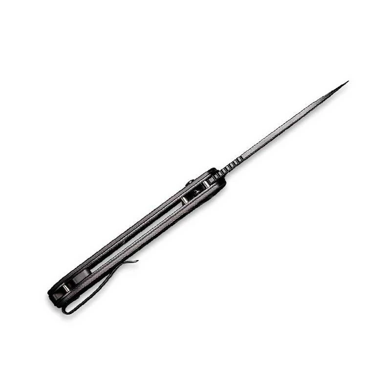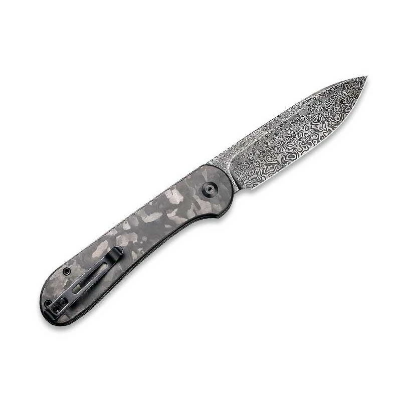 Ce modèle C2103DS3 est une version originale et attrayante du célèbre couteau Civivi Button Lock Elementum. Elle est caractérisée par un manche mesurant 115mm de longueur, en acier inoxydable noir avec plaquettes en fibre de carbone marbrée pour un visuel à couper le souffle ! Certain(e)s pourront y voir une sorte de décoration camouflage très en vogue ces derniers temps. Le clou du spectacle reste bien sûr l’indémodable lame de 88mm en acier damas, que l’utilisateur peut ouvrir en douceur via le mécanisme ball bearing. Une lame particulièrement esthétique, d’épaisseur 3mm (dureté HRC 58-60), qui se déploie grâce au bouton de couleur sombre situé juste à côté du logo contenant la lettre C pour “Civivi” bien sûr. Un bouton qui sert au verrouillage mais aussi au déverrouillage de la lame damas. Ce couteau pliant Civivi Button Lock Elementum C2103DS3 est livré dans une pochette en nylon de couleur noire.