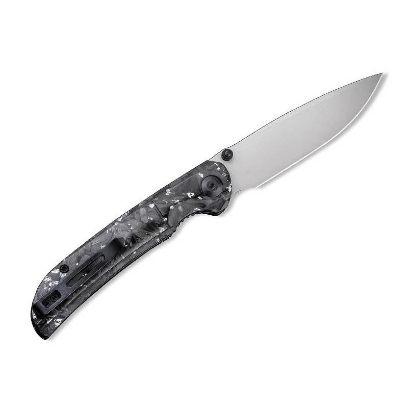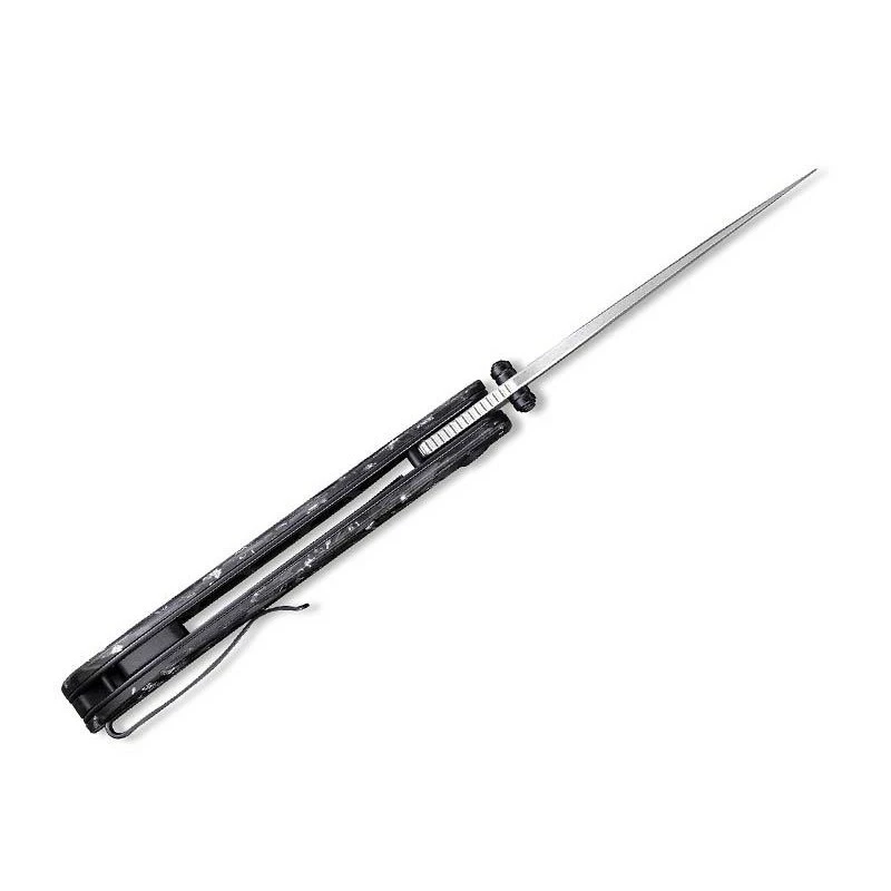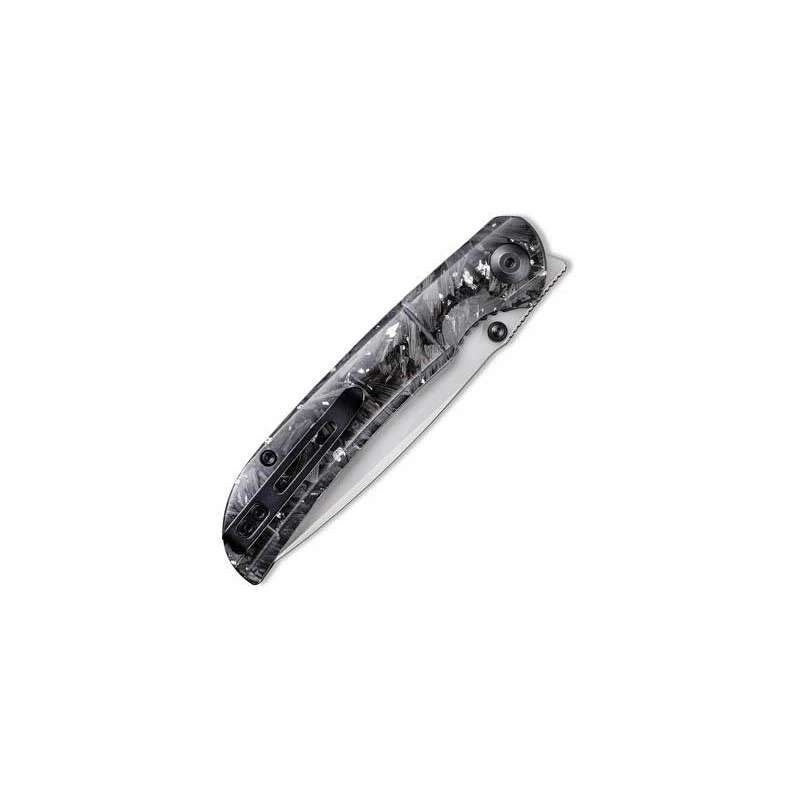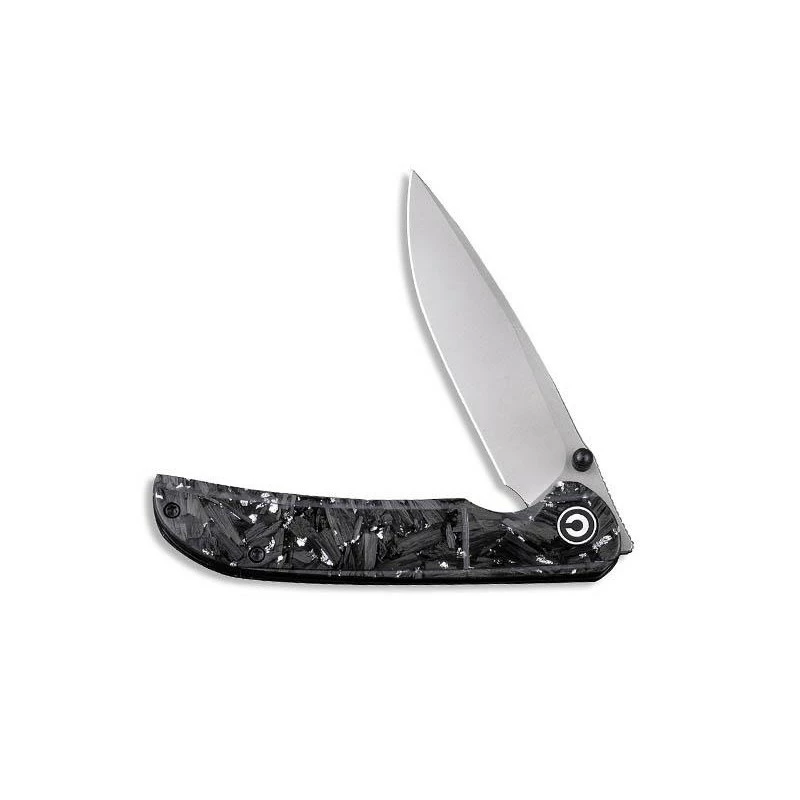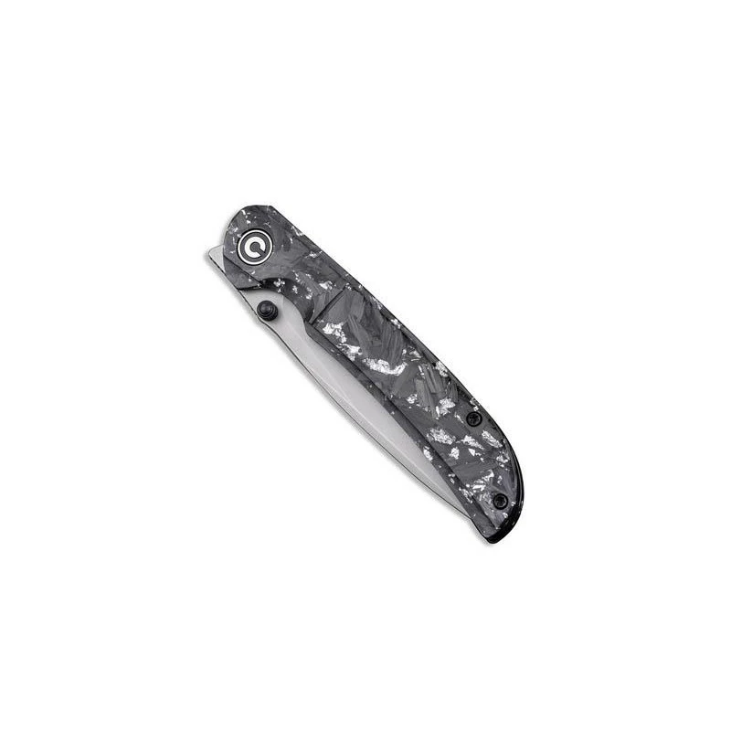 Le couteau Civivi Imperium C2106B atteint un niveau d’élégance extraordinaire. Comment ne pas apprécier son manche fait de résine et comportant des inclusions d’éclats de fibre de carbone et d’argent ? Cela se traduit par une poignée d’apparence sombre, dynamisée par des pointes plus claires. De longueur 11cm, le manche est marqué par le logo Civivi de forme ronde, il intègre une entretoise en G10 et surtout un clip afin de faciliter le transport. Ce couteau pliant Civivi Imperium fibre carbone/argent est doté d’une lame en acier Nitro-V à la finition stonewashed, une finition délavée pierre idéale pour le masquage des rayures. Mesurant environ 88mm de long, elle se déploie simplement et rapidement, et de façon très fluide par le biais du bouton double, le front flipper ainsi que le mécanisme ball bearing. Le verrouillage de la lame s’opère grâce au populaire liner lock. Un couteau Civivi qui allie performances et design : que demander de plus ?
