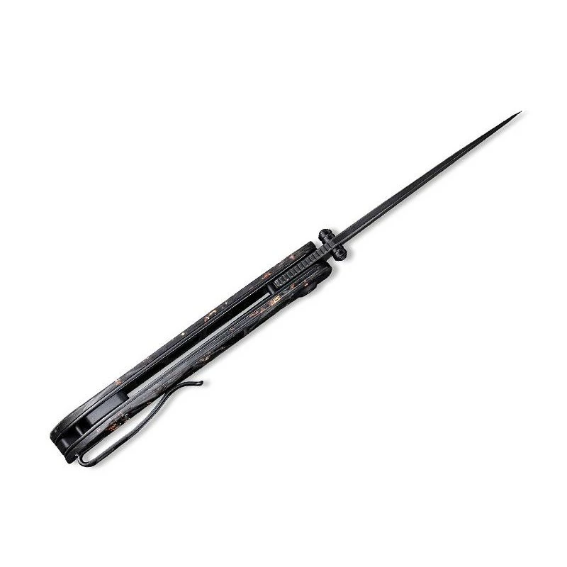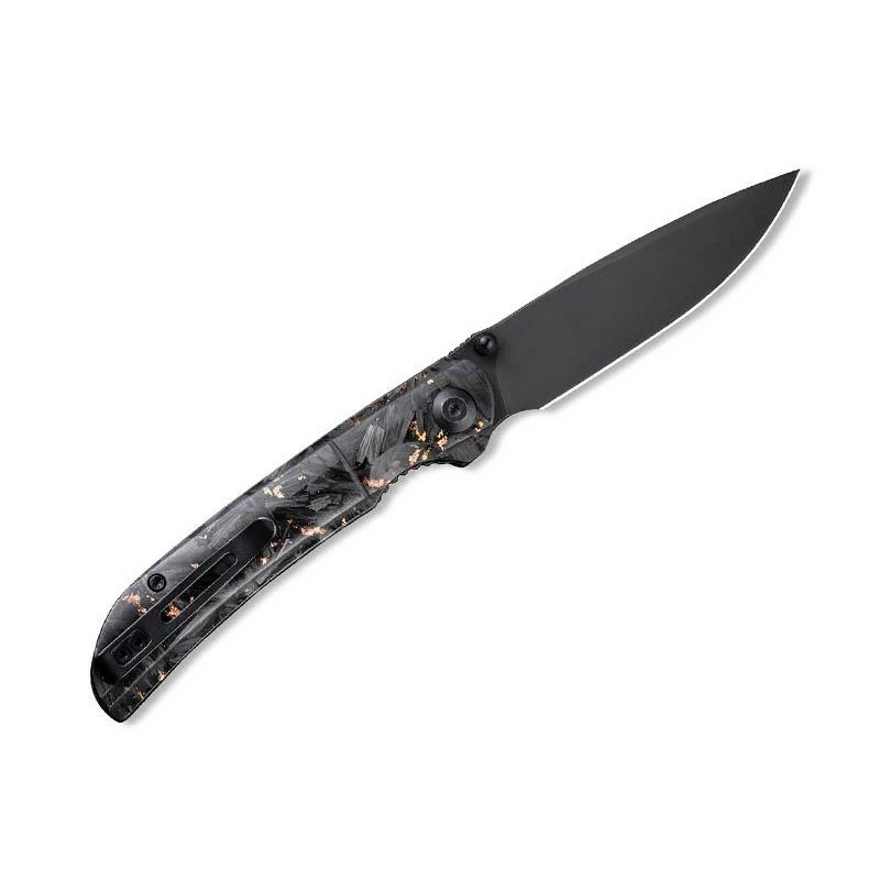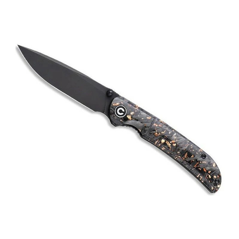Ce couteau Civivi C2106C, modèle Imperium, dispose d’une lame noire blackwash en acier Nitro-V, mesurant à peu de chose près 88mm de longueur. Comme toujours l’ergonomie est de mise si bien que la lame s’ouvre facilement grâce au bouton double et le front flipper, et de façon très fluide via le mécanisme ball bearing. N’ayez crainte, elle sera parfaitement verrouillée via le mécanisme liner lock, un grand classique en coutellerie. Mais toute la subtilité du Civivi Imperium C2106C réside dans son manche de 11cm de long. Fait de résine, il comprend de belles inclusions d’éclats de fibre de carbone et de cuivre, ce dernier apportant des nuances colorées par dessus un ensemble plus sombre. Le manche est très attrayant visuellement parlant, il comprend aussi le logo Civivi ce qui fera plaisir aux nombreux fans. Côté transport, aucun problème grâce à la présence d’un clip au verso.