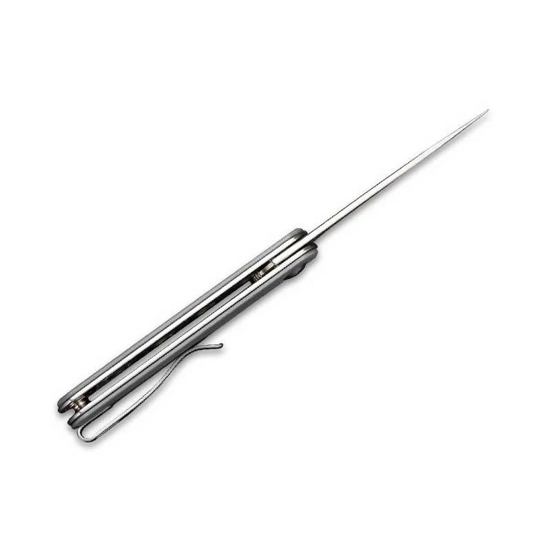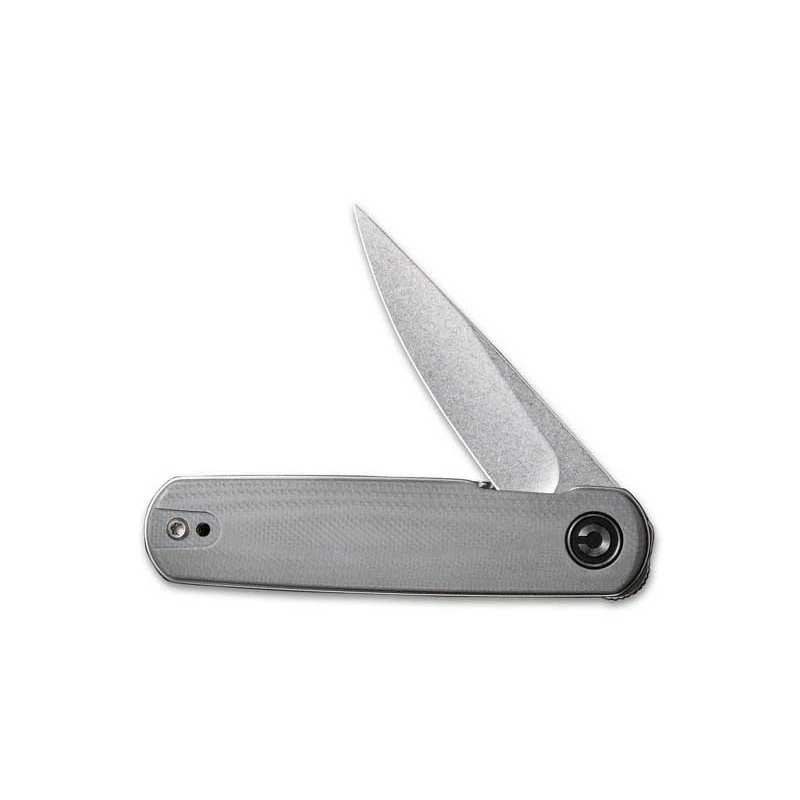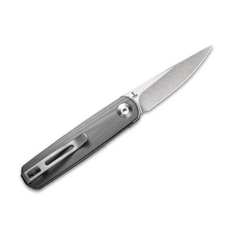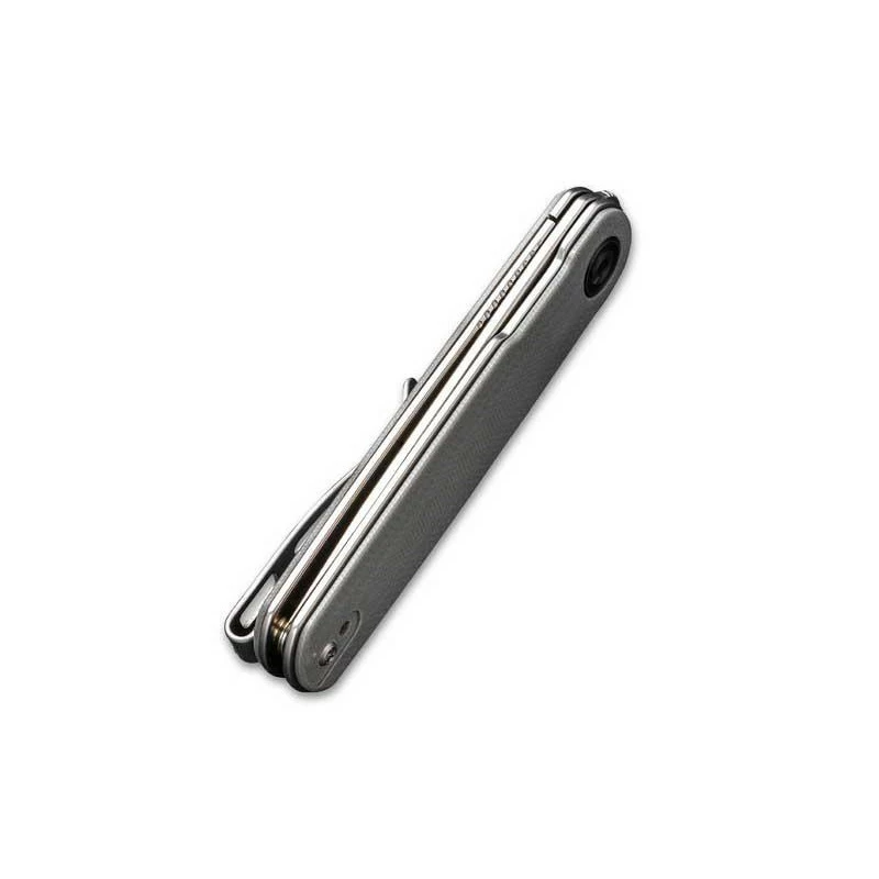 Un design extrêmement propre, sans fioriture, pour ce couteau Civivi Lumi C200242. Son manche en acier inoxydable est surmonté de plaquettes grises en G10 sur lesquelles on peut observer le logo Civivi d’un coloris contrasté qui saute aux yeux. Le petit détail qui plaira aux fans de la marque ! De l’autre côté de la poignée, on peut apercevoir un clip ajouré en inox permettant de facilement transporter le couteau au quotidien.