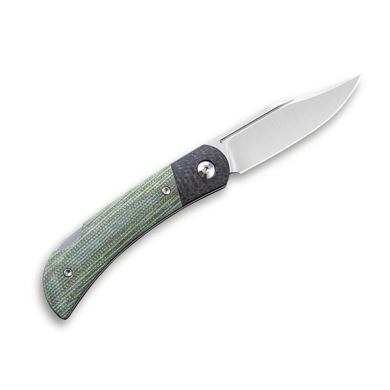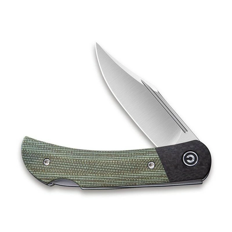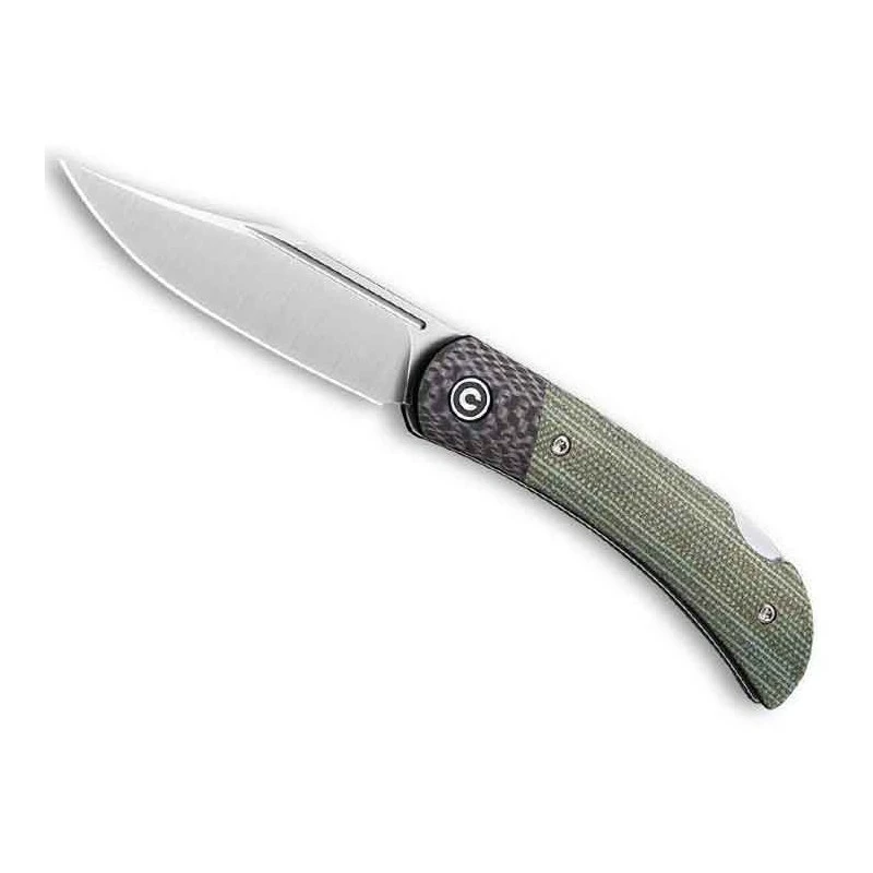 Difficile de rester insensible au charme du couteau Civivi Rustic Gent C914B. Un modèle qui se dote d’un manche de 10cm de long, plein d’originalité, en raison de son aspect très coloré. En effet, on retrouve des plaquettes en G10 coloris vert ainsi qu’une mitre noire en fibre de carbone, pour un mélange des styles et des couleurs, et un résultat final très esthétique. Le petit détail qui fait toute la différence, c’est la présence du logo Civivi en blanc au niveau de la mitre, pour une parfaite visibilité par contraste. En plus d’être belle, la poignée s’avère aussi être confortable à tenir en main : elle cumule les avantages !