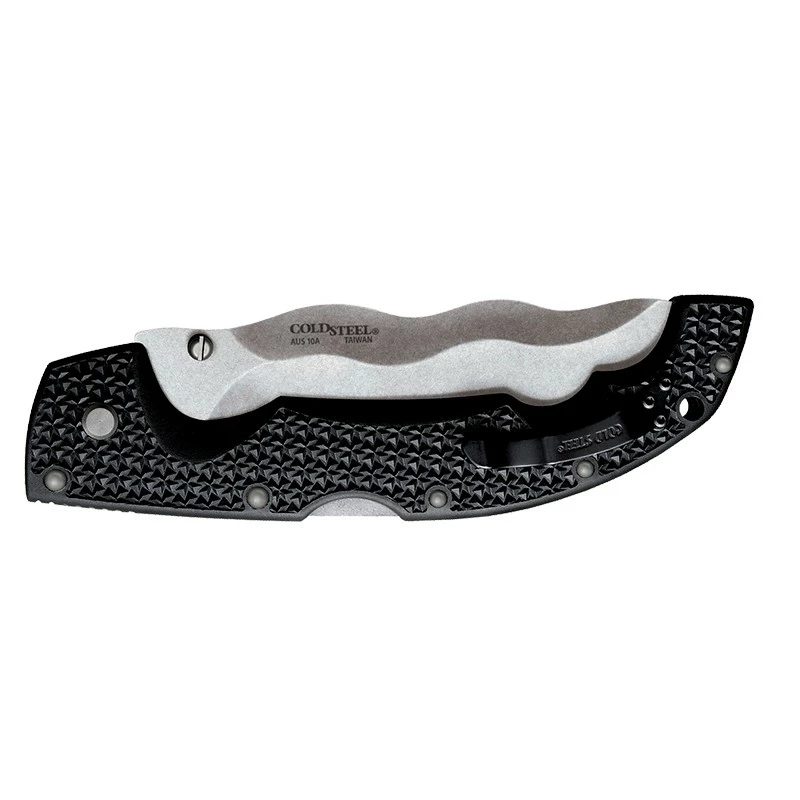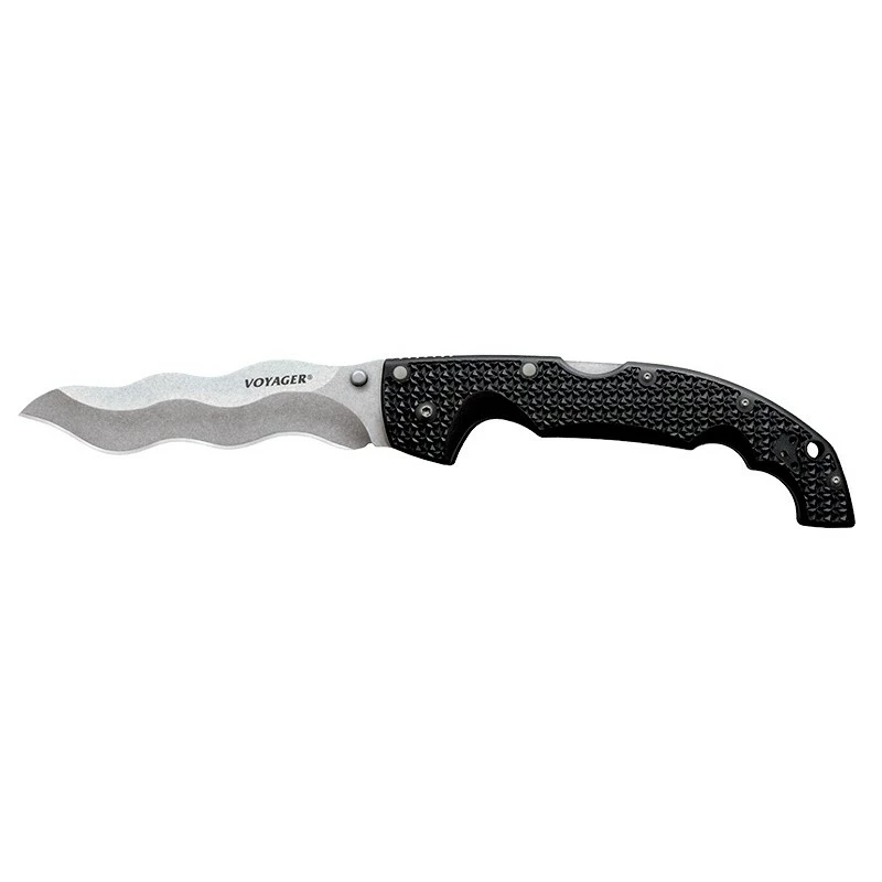 Le Cold Steel Kris Voyager CS29AXW est un couteau polyvalent caractérisé par une lame kriss de 14cm de longueur, en acier AUS10A, sur laquelle on peut lire le texte “Voyager“. Inspirée par les armes d’Asie du Sud-Est, la lame kriss est facile à identifier avec sa forme “serpentin“, ses bords sont très tranchants. Le couteau Cold Steel Kris Voyager convient pour de nombreuses applications comme la survie, la chasse, le camping mais aussi le secourisme. Il est équipé d’un manche noir en Griv-Ex avec doublures en aluminium traitées thermiquement pour toujours plus de solidité, de robustesse, et cela sans altérer le confort d’utilisation. Le transport est grandement facilité par un passe-lacet ainsi qu’un clip ambidextre. Ce couteau Cold Steel utilise le système de verrouillage Tri-Ad Lock, sans aucun doute le plus sûr mais aussi le plus résistant du marché. À noter que le modèle Voyager se décline de différentes façons.