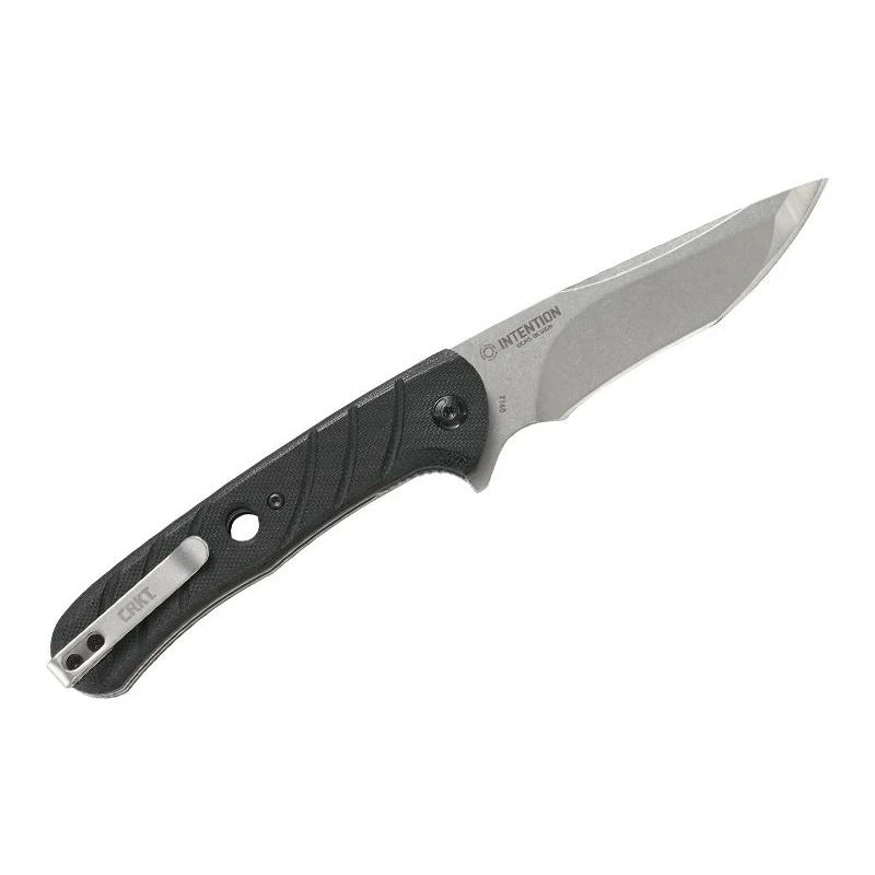 Le CRKT Intention est une réalisation de Eric Ochs en Oregon. Il possède un manche noir en G10 avec ondulations, offrant un grip exceptionnel pour un confort de prise en main extrême, et ce, par tous les temps. La poignée comprend au centre un ajour qui permettra de passer un lacet ou cordon dans l’optique de pouvoir transporter le couteau pliant plus simplement, plus facilement. À noter que le liner lock peut être fermé d’une seule main ce qui améliore considérablement l’ergonomie, clip de poche au dos.