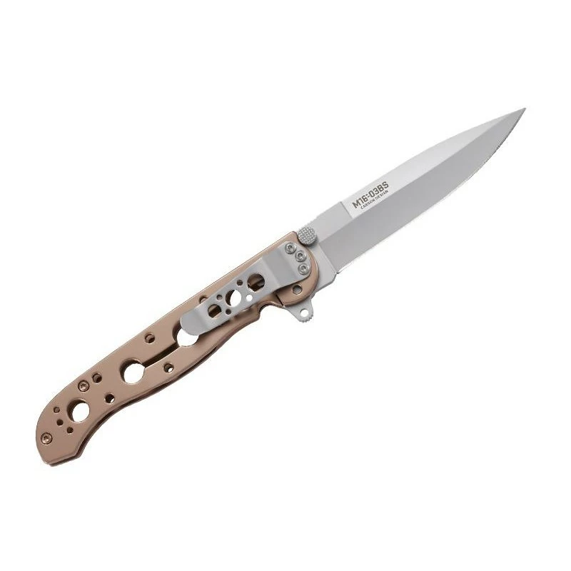 La série M16 CRKT est très populaire, elle est conçue par le regretté Kit Carson du Kentucky, la marque lui rend hommage en apportant de légères modifications à ses œuvres. Il s’agit ici d’un couteau pliant tactique, né pour pouvoir être transporté facilement d’un point A à un point B. Il possède un manche à trous mesurant 12cm de longueur, et fabriqué en acier inoxydable bronzé afin de rehausser le look. Un clip situé au dos de la poignée rend la transportabilité excellente en toutes circonstances.