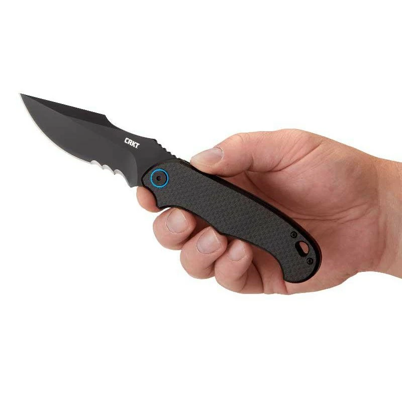Le manche du couteau de poche CRKT P.S.D Black est conçu en G10 ainsi que fibre de carbone assurant solidité, style et confort de prise en main. Le pivot bleu électrique vient rehausser le design de la poignée, la petite touche esthétique qui fait la différence ! Clip de poche noir et trou pour cordon en bout, de sorte à ce que le transport du couteau ne soit jamais un problème.