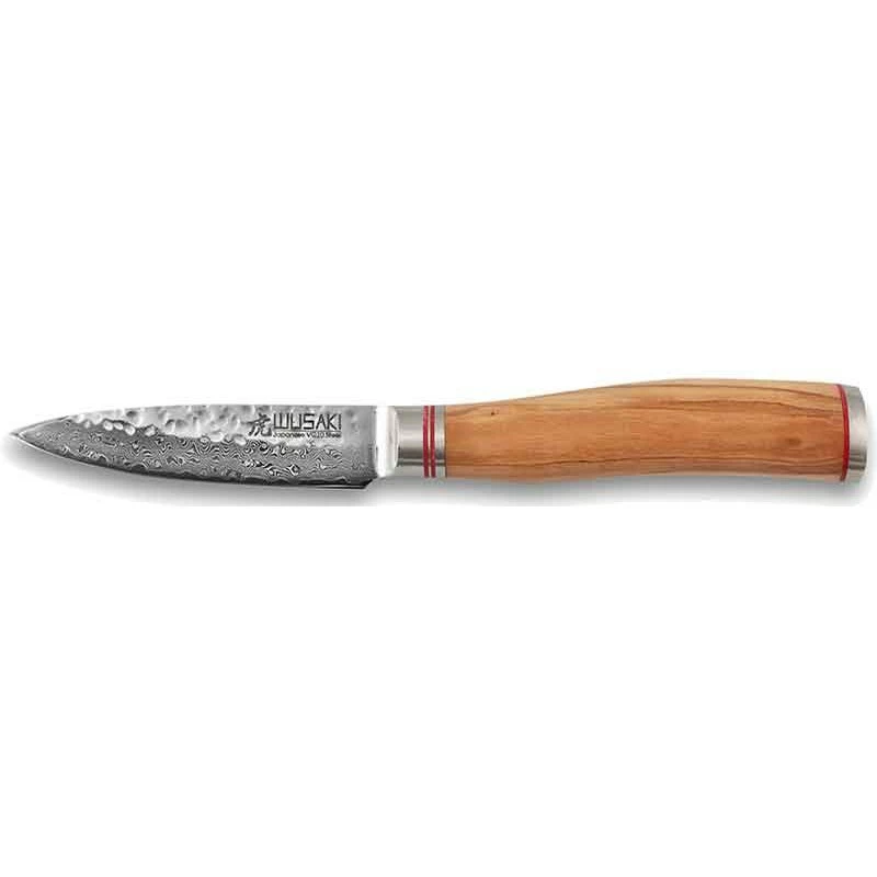 Le couteau d’office Wusaki Damas VG-10 est designé en France, et possède un joli manche en bois olivier dont le veinage est unique. Sa forme bombée assure une excellente ergonomie, si bien que la prise en main est extrêmement confortable, et ce, même en cas d’utilisation prolongée ou professionnelle. Apportant une touche très naturelle en raison du matériau noble utilisé, le manche possède également un culot gravé d’un sigle Japonais. Avec lui, découper les légumes de façon nette et précise est à la portée de tous et toutes !