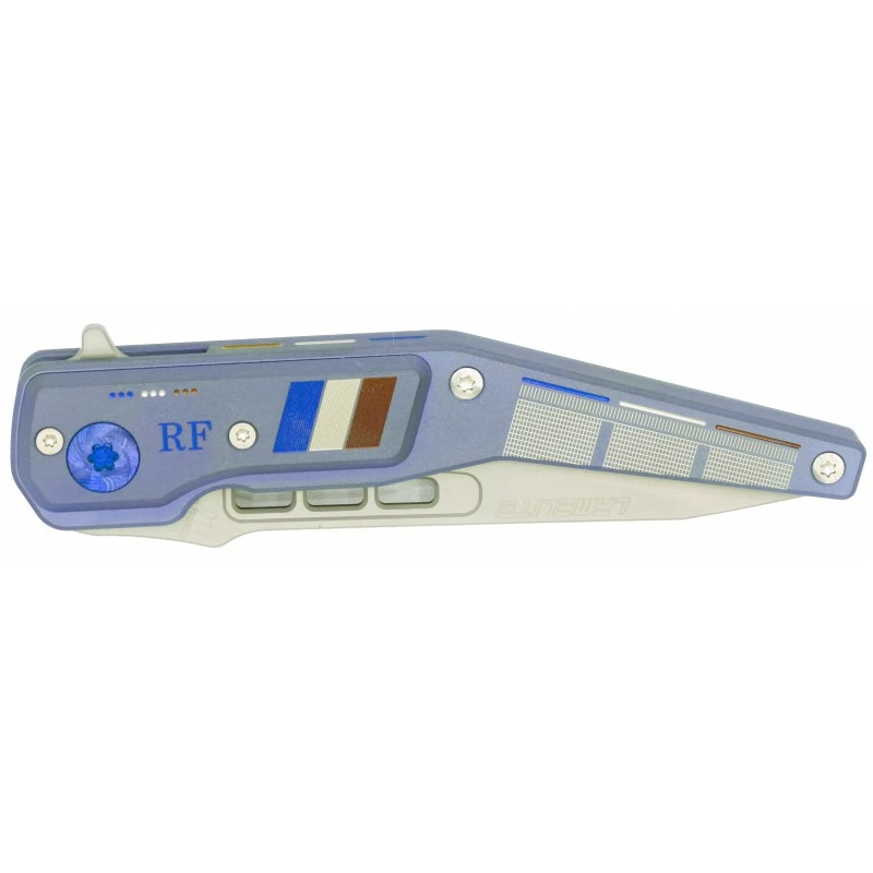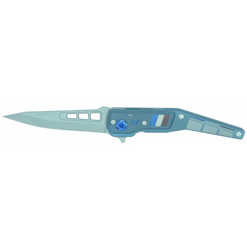 Le manche en titane à la finition bleutée est enrichi de décorations à l’effigie de la France, comme le drapeau tricolore ou encore le sigle “RF” pour “République Française”. En le retournant, vous pourrez observer l’un des plus grands symboles de la France, à savoir la devise “Liberté, Égalité, Fraternité”. Sans oublier le clip de poche d’un bleu plus prononcé qui sublime l’ensemble en plus de permettre un transport plus aisé. D’une grande solidité, la poignée en titane est plus fine au niveau de l’extrémité afin de pouvoir la tenir du bout des doigts.