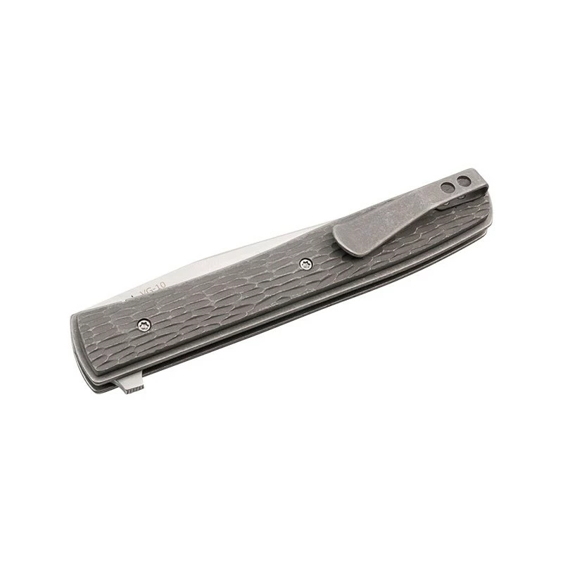 Ce couteau de poche est la dernière version en date de l’Urban Trapper, EDC créé par le coutelier américain Brad Zinker et qui connait un franc succès depuis sa sortie auprès du consommateurs. Le Jigged Titanium adopte un look hyper moderne, avec un manche texturé confectionné par l’assemblage de deux balances à poignée grises en titane sur la colonne vertébrale métallique. Discret et élégant, ce manche offre toutes les garanties de confort et d’ergonomie pour manipuler naturellement la lame. Son clip de poche à la finition Stonewash s’intègre parfaitement à son design. Le couteau pliant Urban Trapper Jigged Titanium dispose d’une lame de 89mm de long forgée en VG10, ce qui lui confère une robustesse et une pérennité importantes. Son système d’ouverture à roulement à billes permet un déploiement pratiquement instantané. Dès lors qu’elle est exposée, un verrouillage Frame Lock vient la bloquer et sécuriser l’utilisateur. Elle est décorée du logo de son fabricant, autrement dit Böker Plus.
