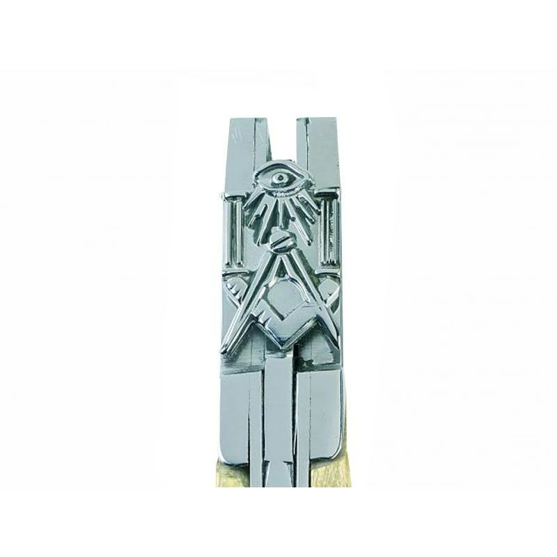 Ce couteau pliant va faire le bonheur des adeptes de la franc-maçonnerie. Il possède un manche en acacia comprenant une jolie mitre arrière tréflée, mais aussi un ressort guilloché où l’on observe un œil, mais aussi l’équerre ainsi que le compas, soit les symboles de la franc-maçonnerie. La poignée est dotée d’une courbure particulièrement élégante, elle s’affine en bout afin d’être saisie avec toujours plus de facilité. Ce couteau de franc-maçon est aussi doté d’une lame en acier inoxydable Z100 présentant des volutes sur le dos pour un effet très esthétique. La lame est gravée par l’équerre ainsi que le compas, ces derniers encadrent la lettre G, possibilité de gravure au dos en supplément (option facultative). Une très belle pièce, qualitative, pour les amateurs de couteaux, et de franc-maçonnerie bien sûr !