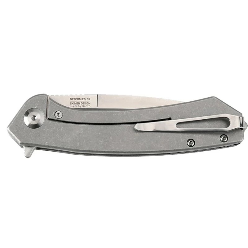 Le Ganzo Skimen GSKIMENRD possède bien entendu une lame, de forme drop point, mesurant précisément 85mm de long, ni plus, ni moins. Elle est fabriquée en acier D2, un acier tranchant réputé pour sa résistance à la corrosion ainsi qu’à l’usure. N’oubliez pas que la lame est personnalisable par gravure sur les deux faces, elle est d’ailleurs décorée sur la face avant par le nom de la série, ici Adimanti. Très simple d’utilisation, la lame peut être rapidement déployée par le biais du flipper, le système de verrouillage est ici de type liner lock.