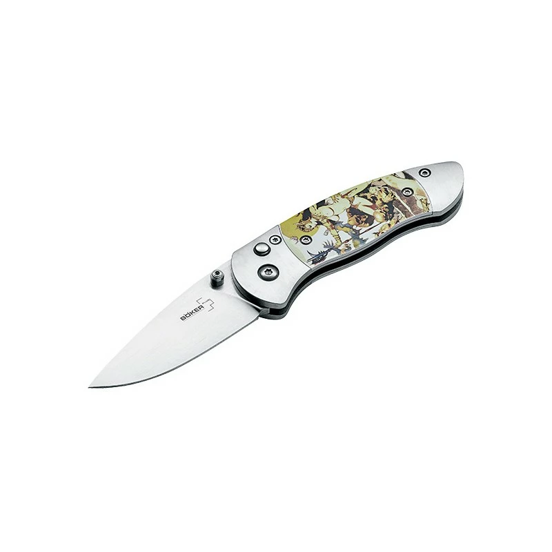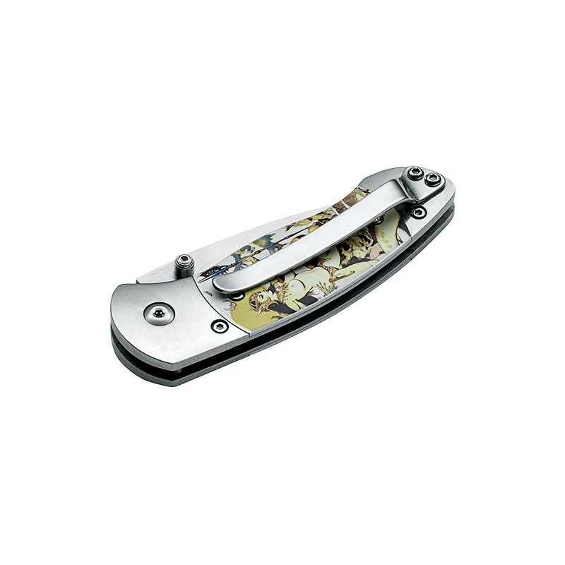Le très célèbre artiste Américain Franck Frazetta est à l’honneur sur ce couteau pliant Böker Plus 01BO650. Pour rappel, il a commencé comme dessinateur de bandes dessinées, avant de concevoir des publicités pour magazines populaires et finir par des affiches de film pour le cinéma. Une véritable “success story” à l’Américaine que nous rappelle ce couteau Böker Plus. Sa particularité, c’est son manche en aluminium mettant en avant les incroyables illustrations de Frazetta, ici la célèbre “Ghoul Queen“. Très décorative, la poignée mesure 88mm de long, et intègre un clip au dos, ce qui procure une facilité de port au quotidien. De quoi avoir en permanence un souvenir de Franck Frazetta dans la poche !