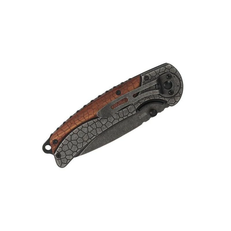 Ce couteau Herbertz 565012 est doté d’une lame en acier inoxydable 420 à cran intérieur et à bouton double finition “stonewashed”. Original, le manche de ce couteau est conçu en acier avec insertion pacca motif écaille avec clip.