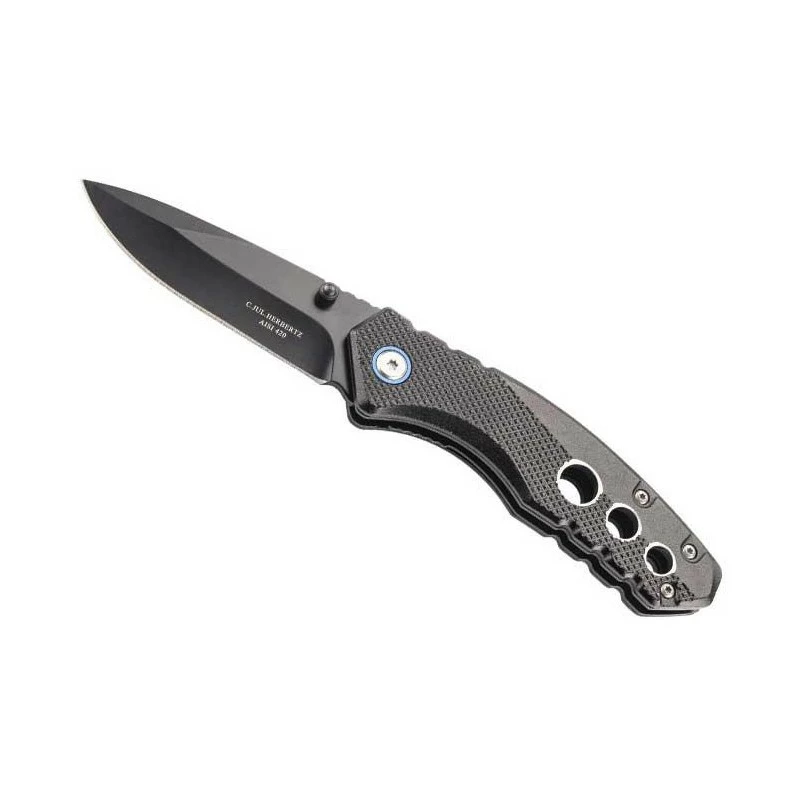 Portant la référence 589711, ce couteau pliant Herbertz dispose d’un design très sombre, entièrement noir. Dans un premier temps, il possède une lame de 75mm de long en acier 420 à cran intérieur (Liner Lock) et bouton double pour une ouverture rapide. Une lame avec revêtement noir, et marquage du texte “C.JUL Herbertz” sur la face avant, de façon très discrète. Dans une même lignée, le manche est lui aussi noir, avec une fabrication en aluminium : il est sublimé par trois trous de tailles décroissantes pour l’effet design. Agréable à tenir en main, le manche assure aussi une excellente transportabilité du fait qu’il ne mesure que 11cm de longueur. Relativement léger (poids de 114g), ce couteau Herbertz alu/inox noir 589711 possède aussi un clip gris argent au dos pour une fixation à la poche ou à la ceinture. Un couteau de poche de fabrication Allemande qui vous accompagnera partout sans la moindre difficulté !